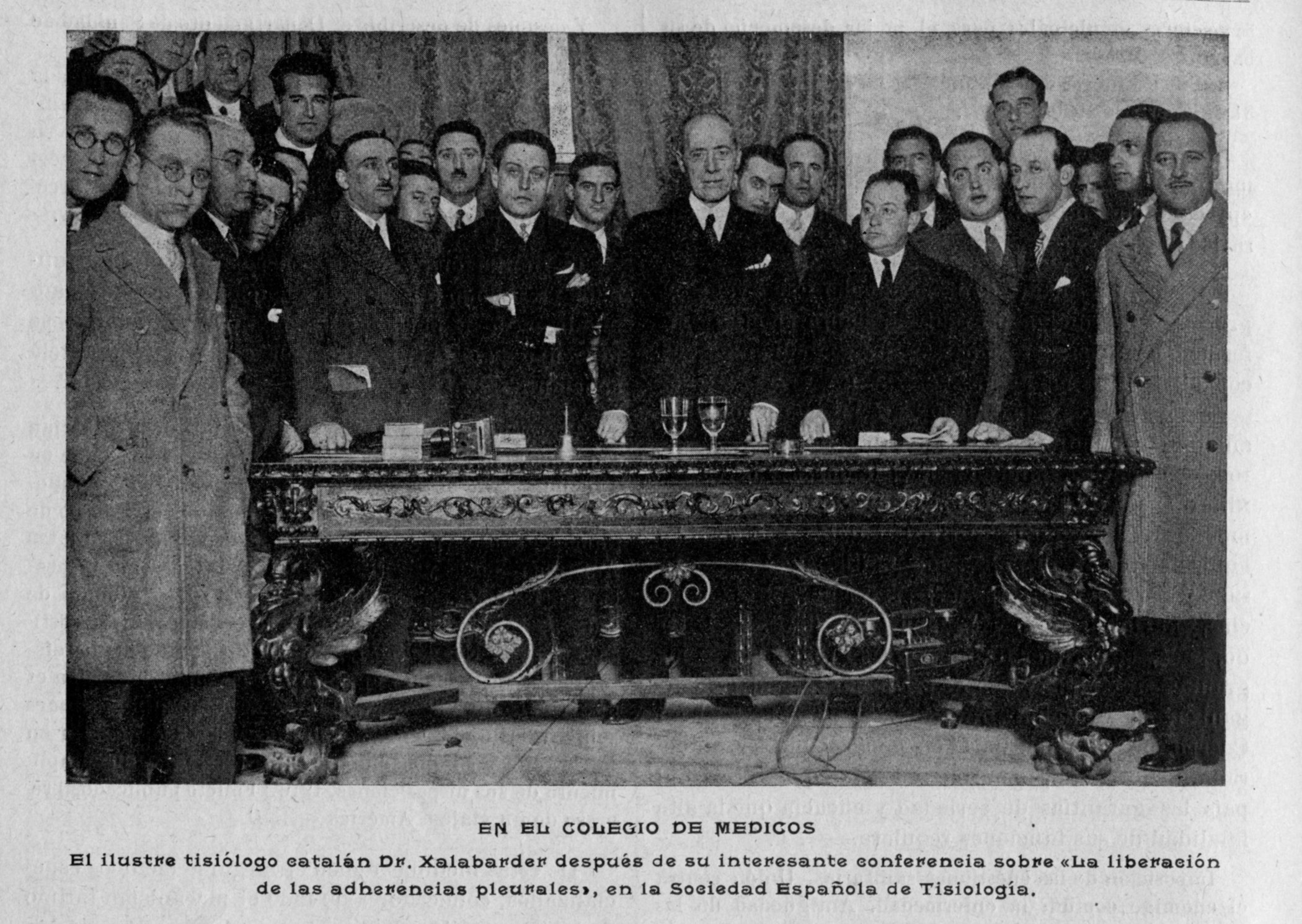 El iluste tisiólogo catalán Dr. Xalabarder después de su conferencia en el Colegio de Mérdicos sobre “La liberación de las adherencias pleurales”; se enmarcó dentro de las sesiones de la Sociedad Española de Tisiología. Marzo 1931. El Siglo Médico, T. 87, 1931, pag. 288