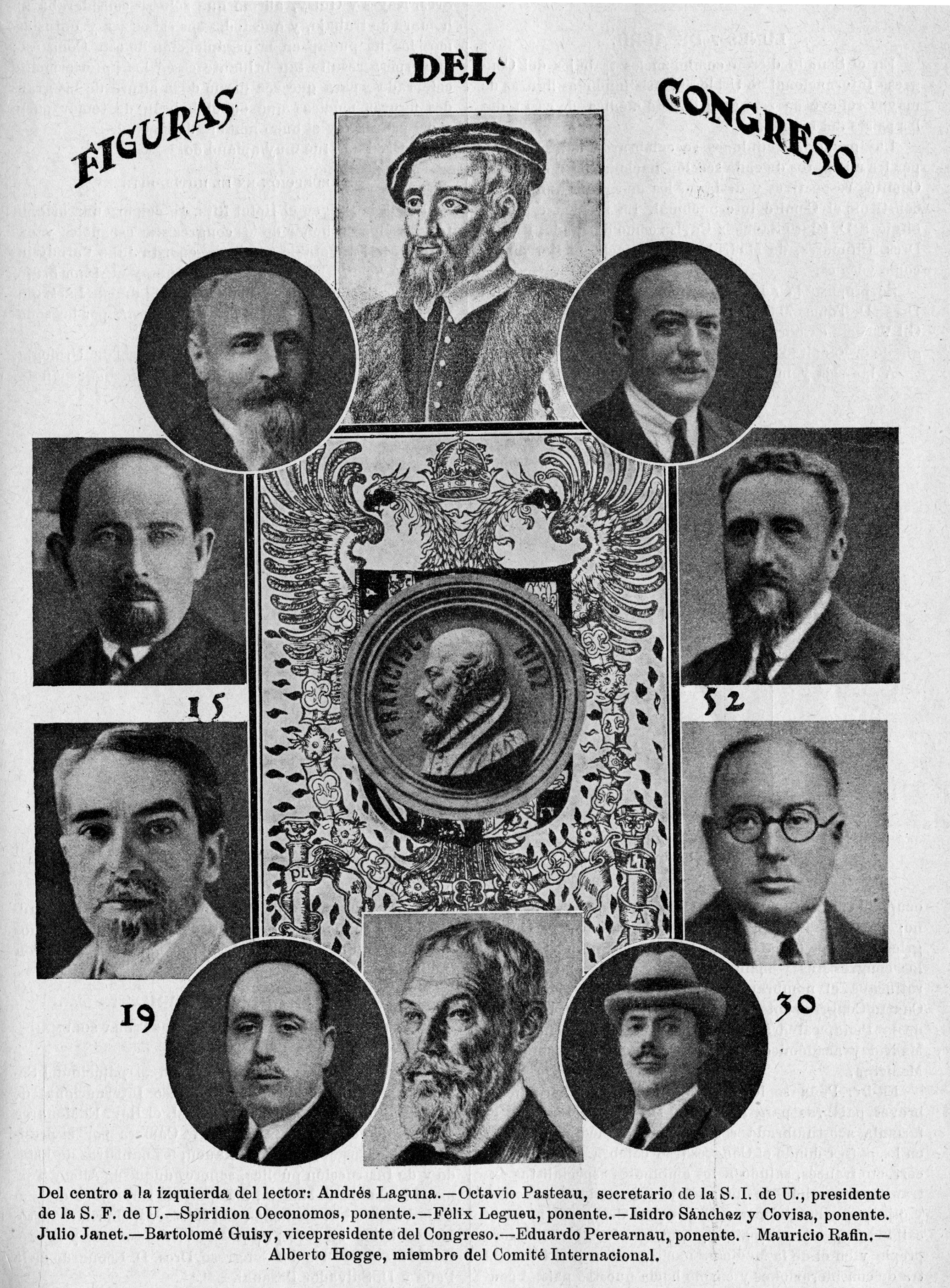 Figuras del Congreso Internacional de Urología. Madrid Abril de 1930. En sentido contrario a las agujas del reloj partiendo del retrato superior de Andrés Laguna: Dres. Octavio Pasteau, Spiridion Oeconomos, Felix Legueu, Isidro Sánchez y Covisa, Julio Janet, Bartolomé Guisy, Eduardo Perearnau, Mauricio Rafin y Alfredo Hogge.