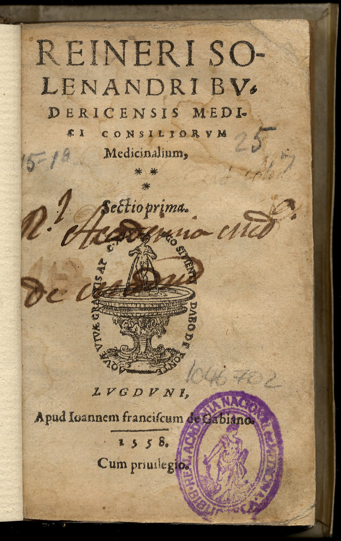 SOLENANDER, Reiner. – Consiliorum medicinalium sectio prima. – Lugduni : apud Ioannem Franciscum de Gabiano, 1558. – [12], 362 p. ; 12º (12 cm). – Perg.