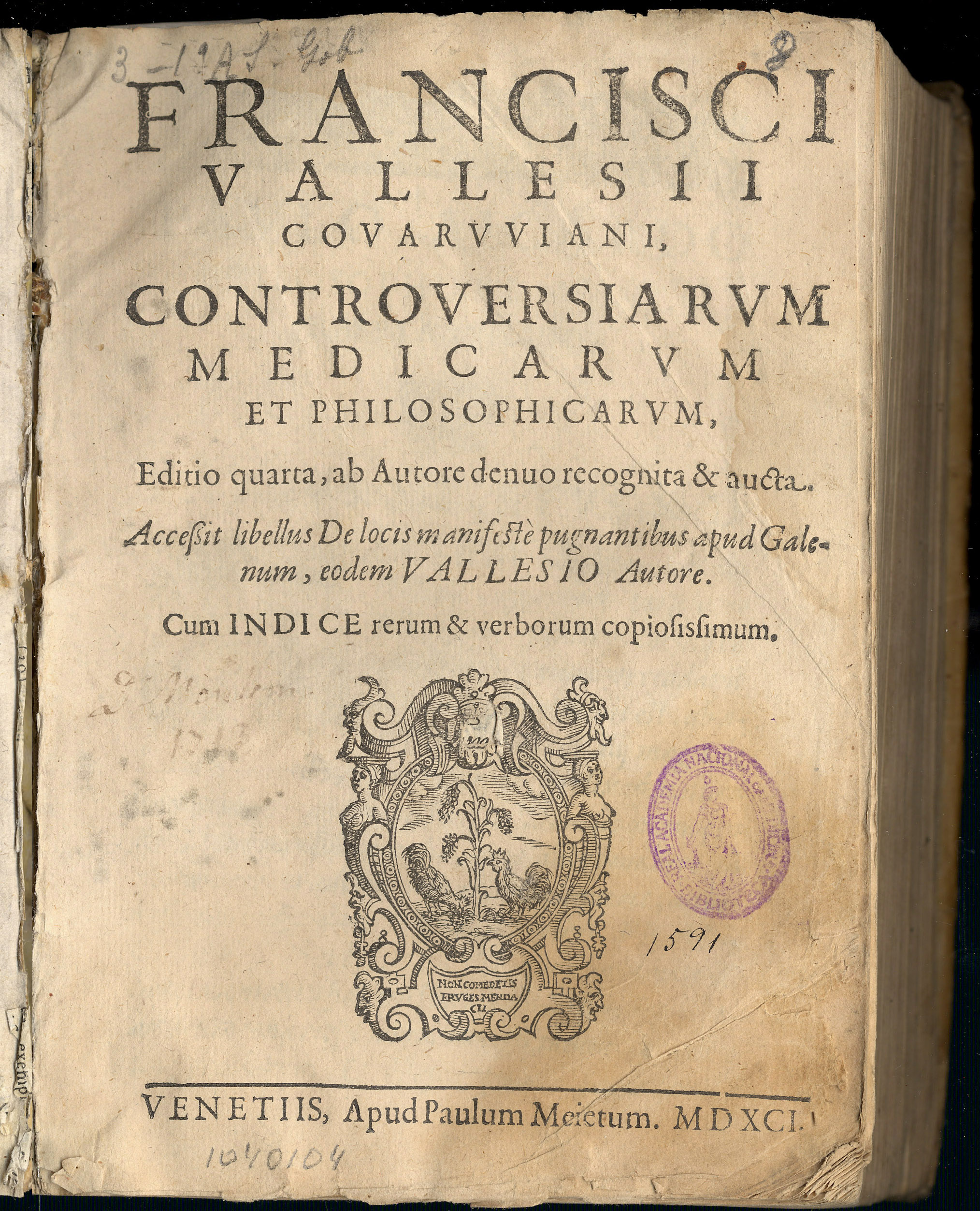 VALLES, Francisco (1524-1592). – Controversiarum medicarum et philosophicarum. – Venetiis : apud Paulum Meietum, 1591. — [15], 323 h. ; 4º [21 cm.]. — Perg.