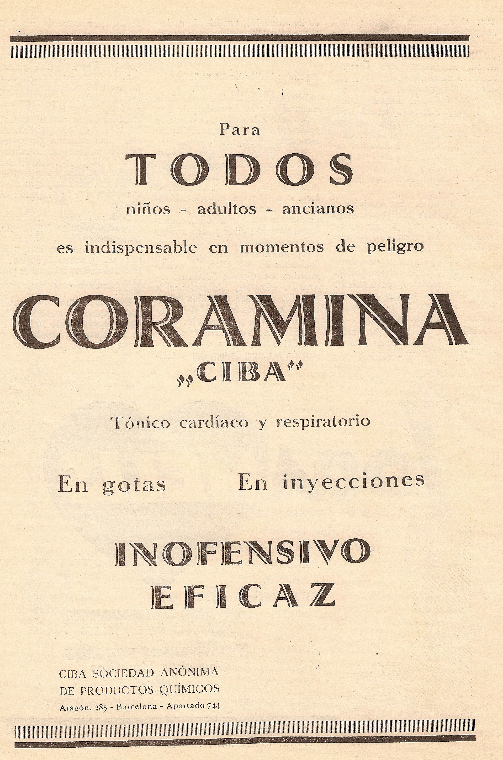Coramina CIBA. Tónico cardiaco. Archivos de Medicina, Cirugía y Especialidades. 9 de diciembre de 1933.