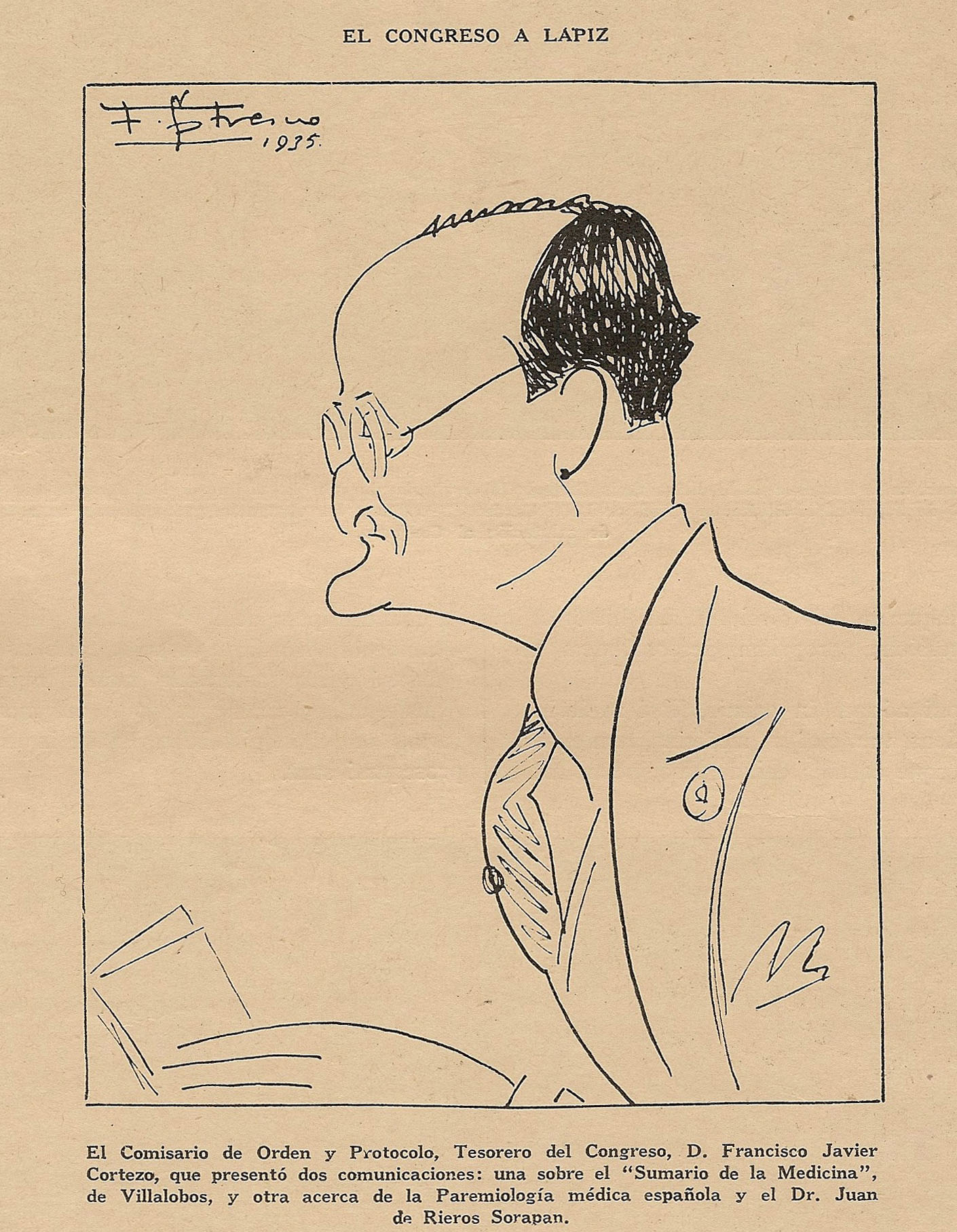 Cortezo, Francisco Javier. Congreso Internacional de Historia de la Medicina. Madrid. El Siglo Médico, 1935. Caricatura