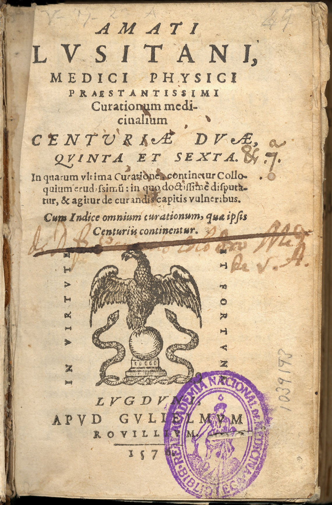 RODRIGUES DE CASTELO BRANCO, João (1511-1568). – Curationum medicinalium centuriae duae, quinta et sexta… – Lugduni : Apud Gullelmum Rovillium, 1576. – 639, [33] p. ; 12º [12 cm.]. –  Piel repujada.