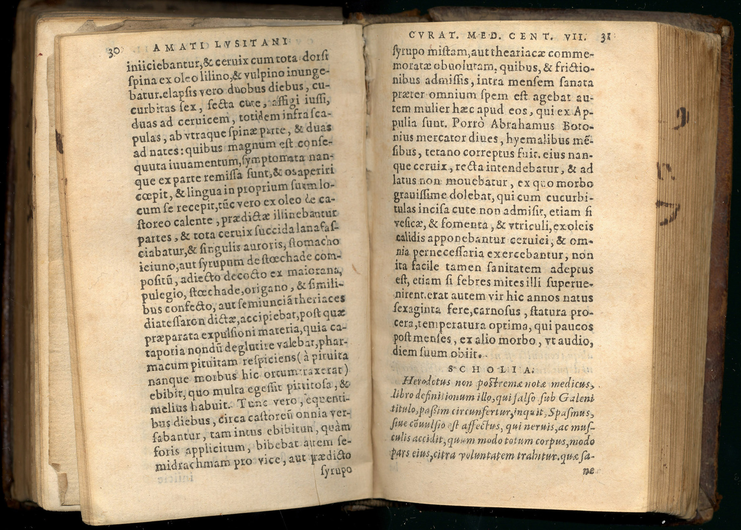 RODRIGUES DE CASTELO BRANCO, Joâo (1511-1568). — Cvrationum medicinalium centuriae septima… — Lugduni: apud Guliel. Rovil., 1580. — 323, [12] p. ; 12º [12 cm.]. – Piel repujada.