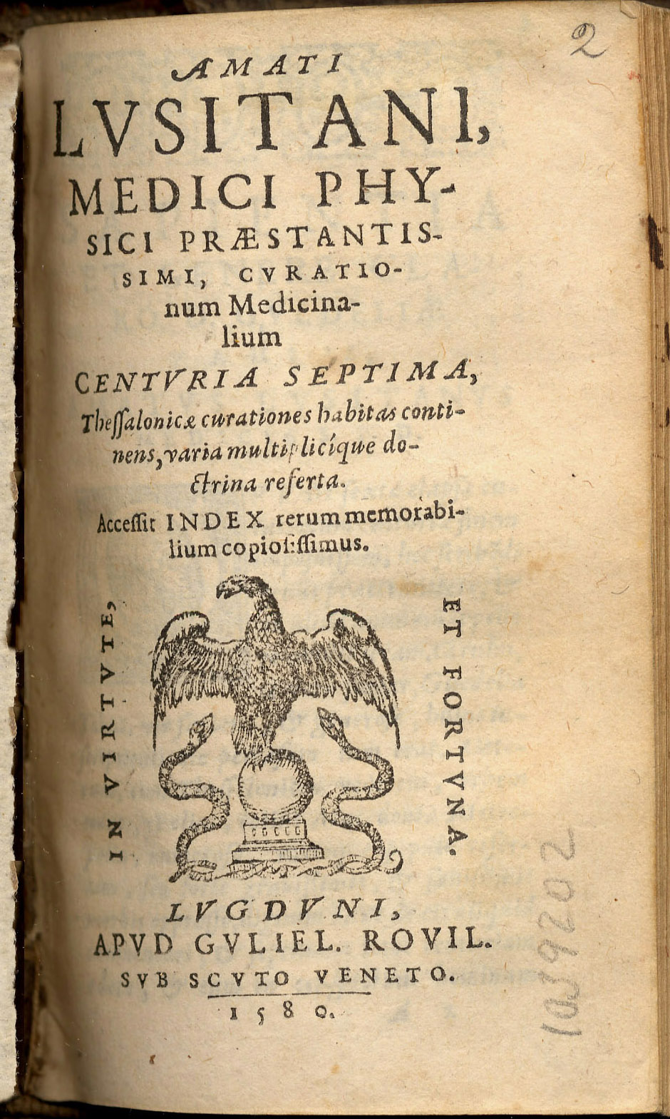 RODRIGUES DE CASTELO BRANCO, Joâo (1511-1568). — Cvrationum medicinalium centuriae septima… — Lugduni: apud Guliel. Rovil., 1580. — 323, [12] p. ; 12º [12 cm.]. – Piel repujada.