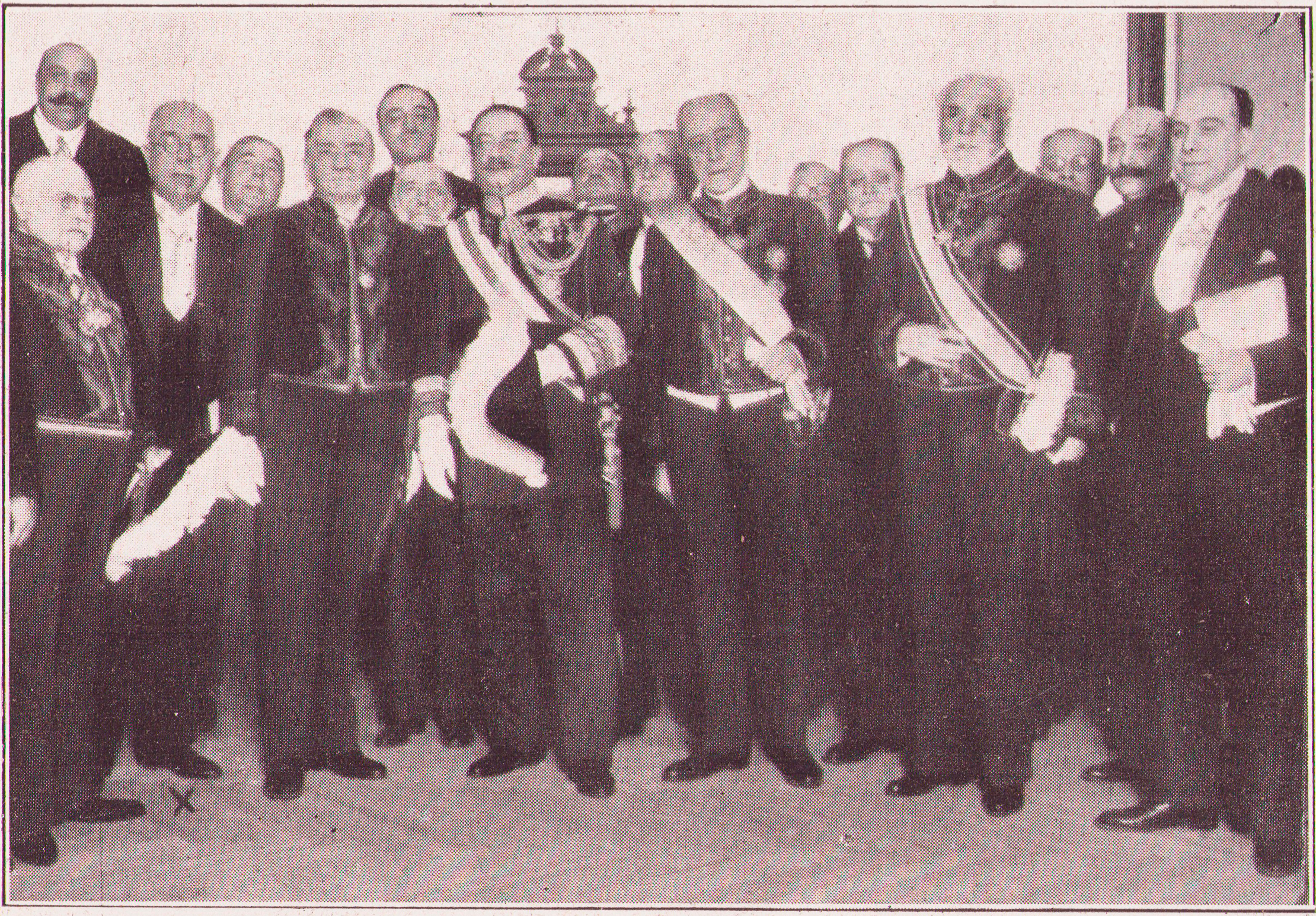 Madrid: El notable medico doctor D. Laureano de la Peña (x), despues de su ingreso en la Real Academia de Medicina, con el jefe del gobierno, el presidente de dicha real academia y varias personalidades que asistieron.