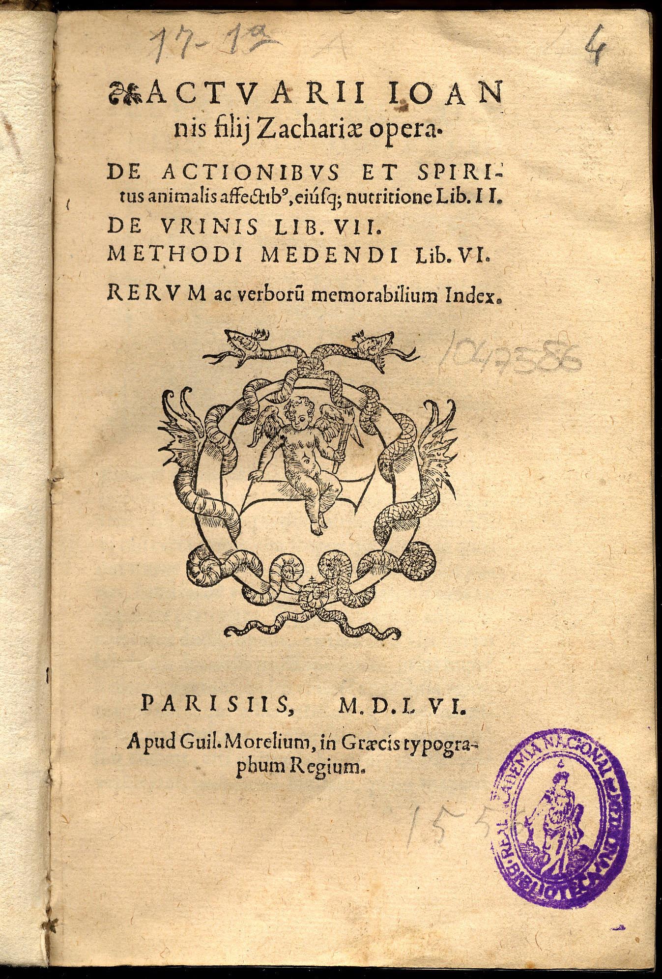 ACTUARIUS, Johannes. — De actionibus et spiritus animalis assectib, eiusque, nutritione Lib. II […]. – Parisiis : apud Guil. Morelium, 1556. — 1 v. (pag. var.) ; 8º (17 cm). – Perg.