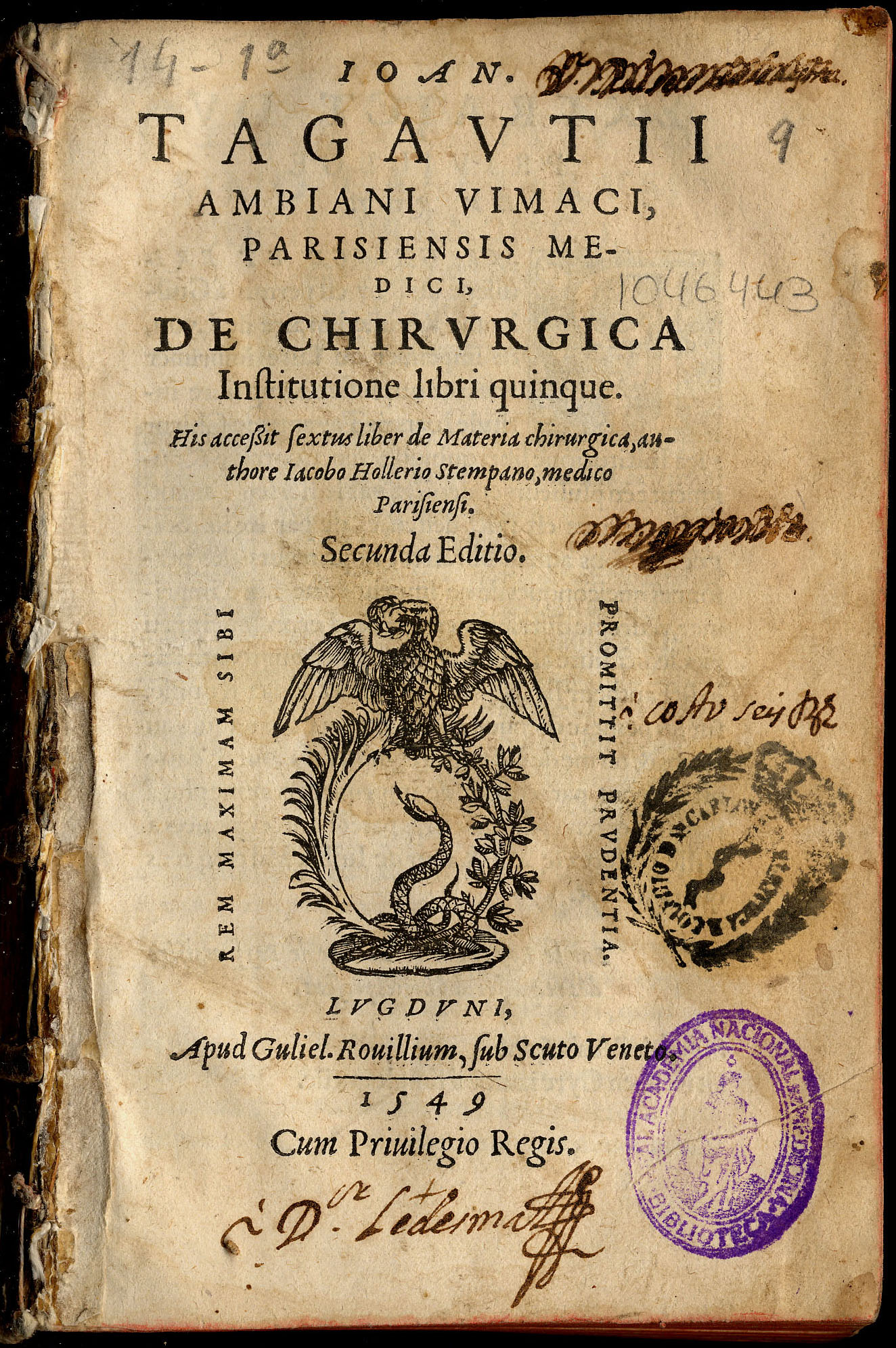 TAGAULT, Jean (m. 1545). — De chirurgica institutione libri quinque…. — Lugduni : apud Guliel. Rouillium, 1549.– [64], 572 p. ; 8º (17 cm).