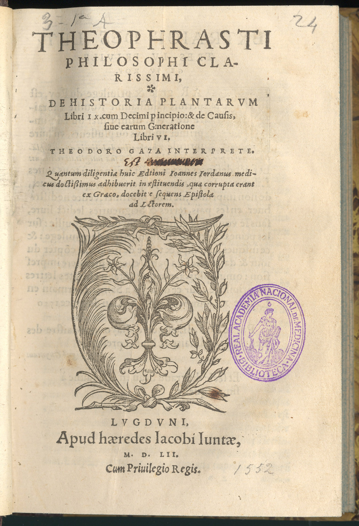 TEOFRASTO (GAZA, Theodorus (ca. 1400 – ca. 1475). – De historia plantarum libri IX… – Lugduni : apud haeredes Jacobi Juntae : excudebat Nicolaus Bacquenoius, 1552. – [56], 399, [14] p. ; 8º [16 cm.]. – Hol.