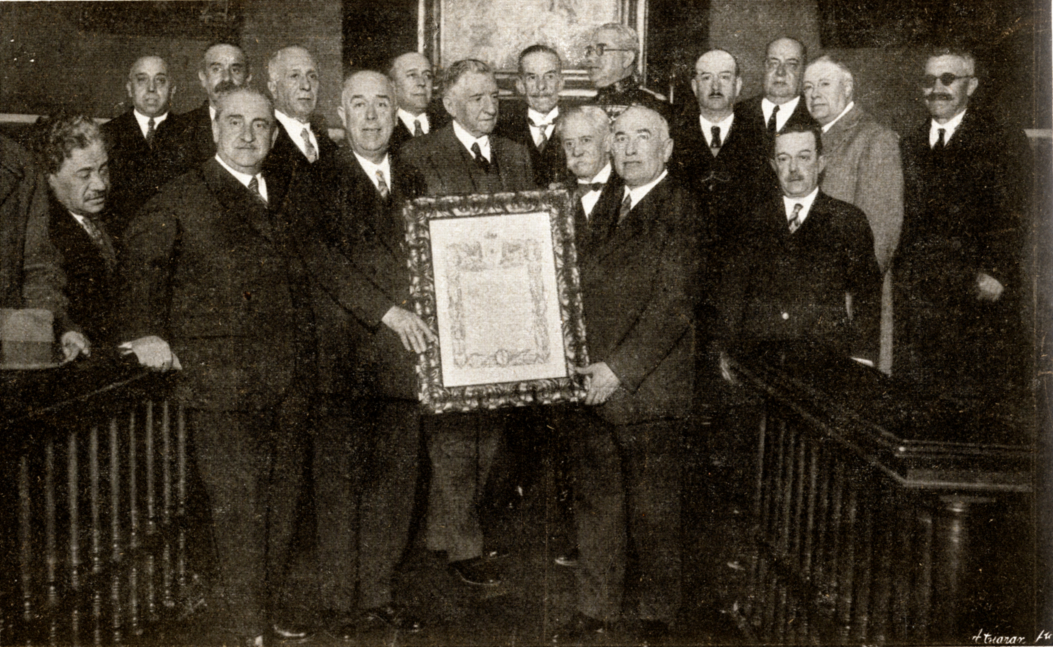 En la Real Academia Nacional de Medicina, el alcalde de Ciudad Real hace entrega al doctor Leonardo de la Peña del título de hijo predilecto de Ciudad Real. Gaceta Médica Española, 53, Feb. 1931