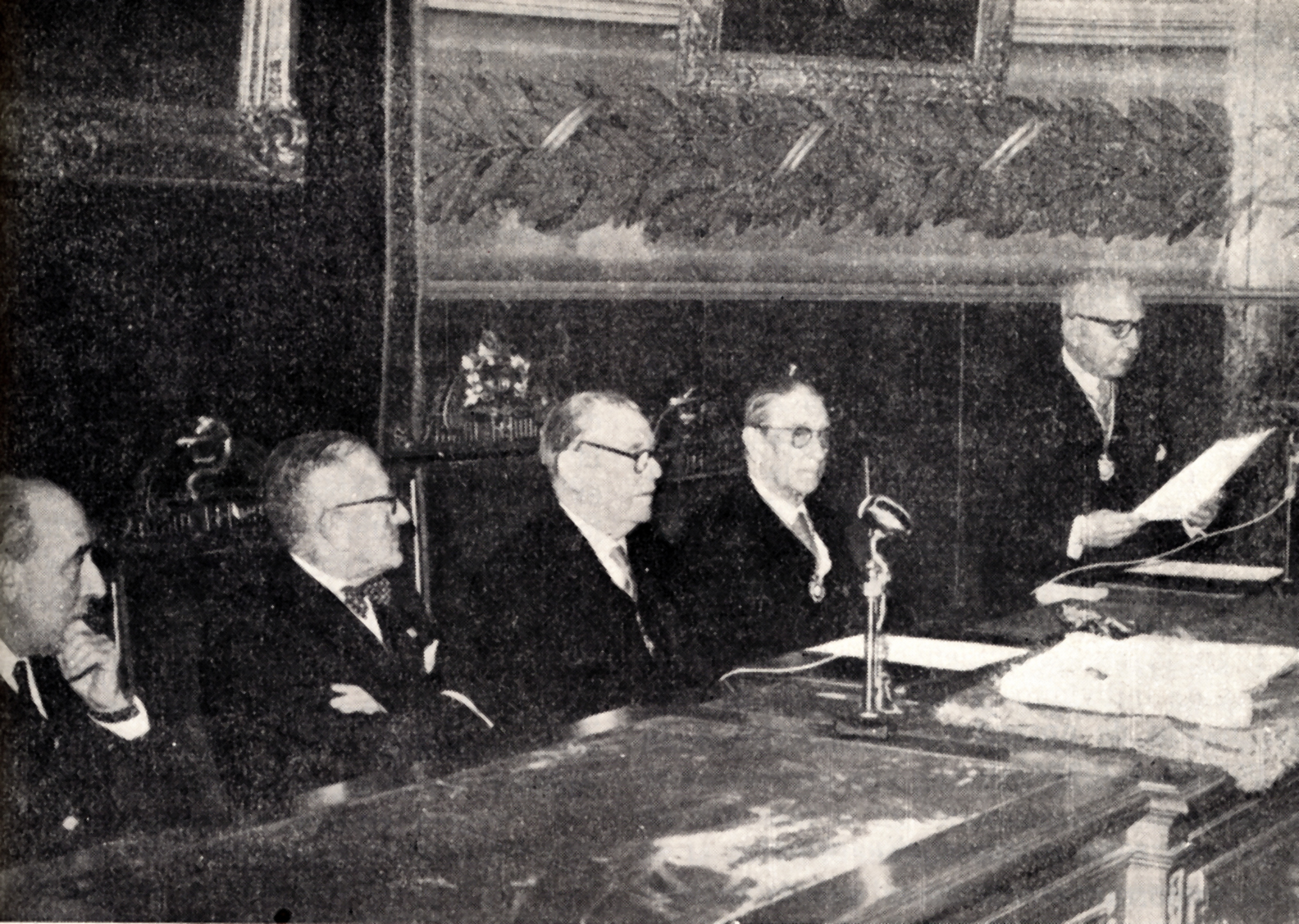 Mesa presidencial de la toma de posesión como Académico de Número de la Real Academia Nacional de Medicina del Prof. Primitivo de la Quintana López. Preside el Prof. Palanca, que tiene a su derecha a los Excmos Sres. D. Jesús García Orcoyen, Director General de Sanidad, y D. Benigno Lorenzo Velázquez, Decano de la Facultad de Medicina de Madrid; a su izquierda, los Excmos Sres. D. Manuel Bermejillo Martínez, Vicepresidente de la Corporación, y D. Valentin Matilla, Secretario Perpetuo, que lee el acata de nombramiento del nuevo académico.