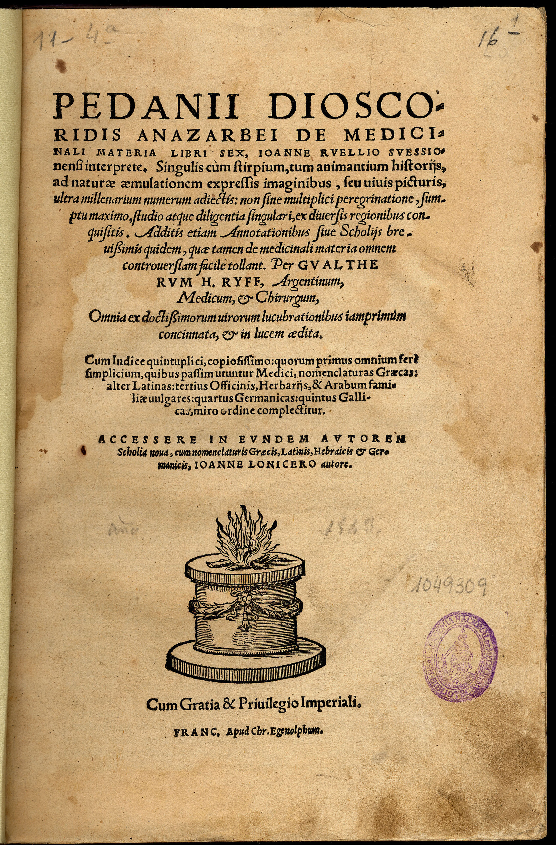 RUEL, Jean. — De materia medica libri sex — Basileae : apud Mich. Ising., 1542. — [30], 479, [100] p. ; 8º (17 cm.).