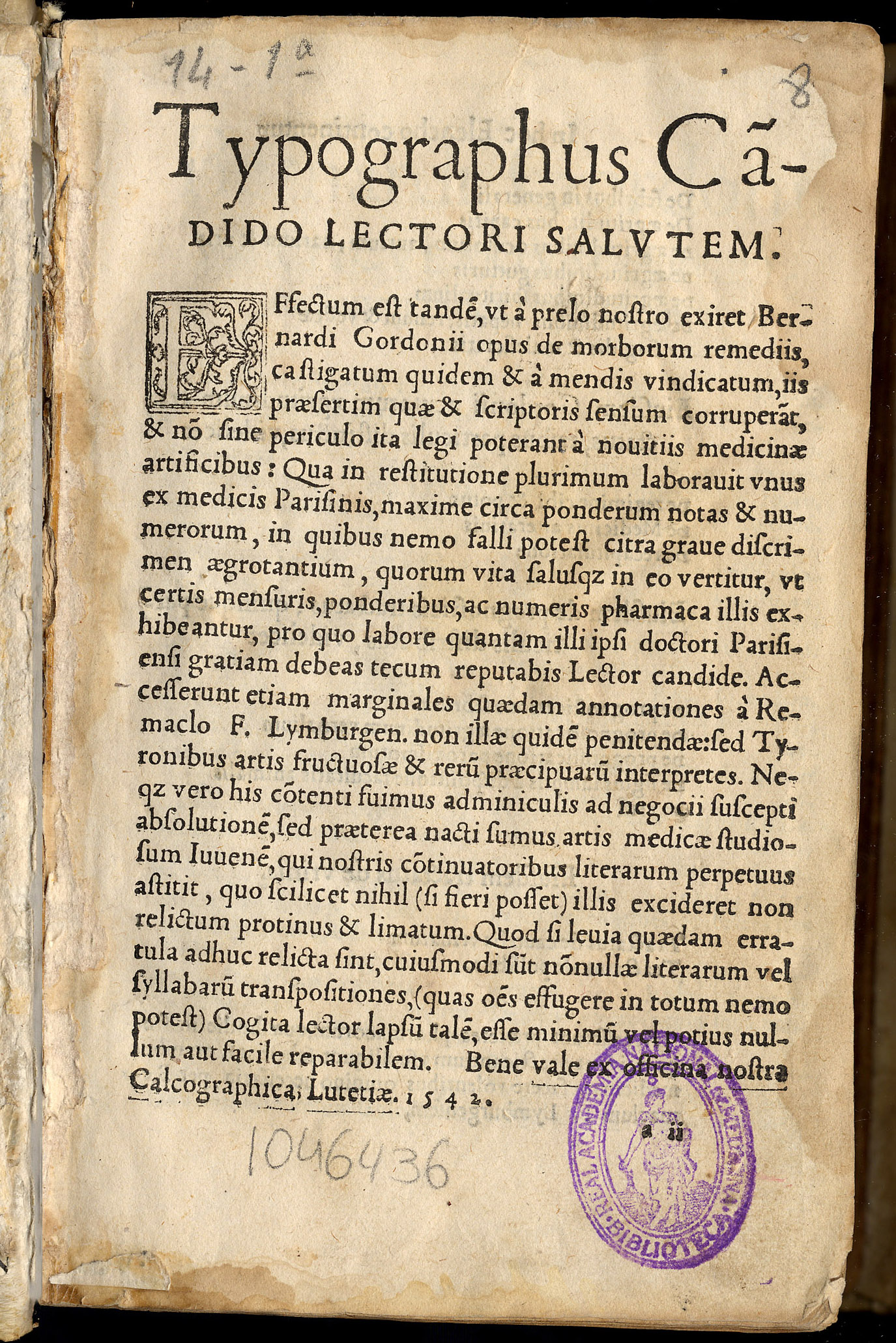 GORDONIUS, Bernardus (c. 1283 – c. 1308). — De morborum. — Lutetiae : [S. n.], [1542]. — [12], 488 p.; 8º (18 cm). – Perg.