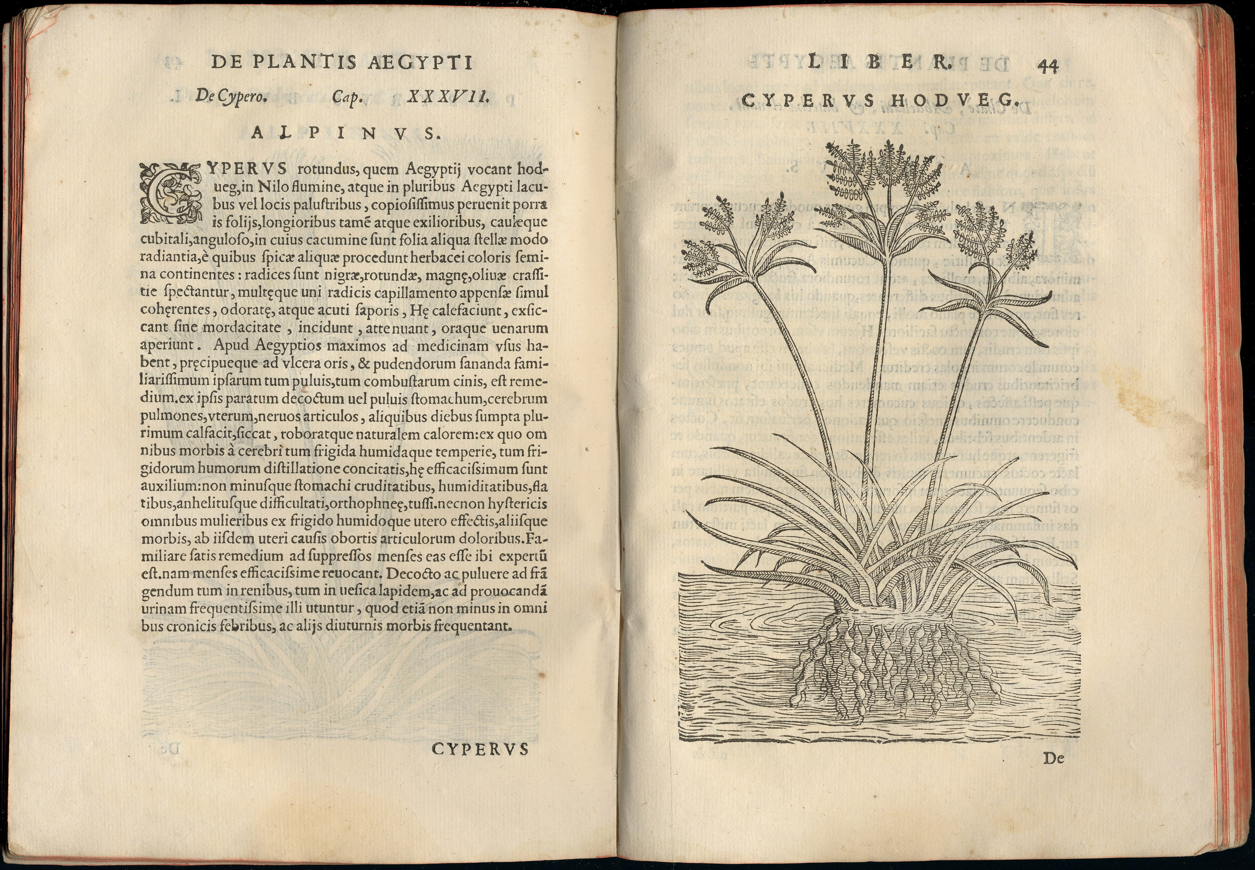 ALPINO, Próspero. – De plantis Aegypti. – Venetiis : apud Franciscum de Franciscis Senenfem, 1592. – [8], 80, [10] p. : il. ; 4º (23 cm). – Perg.