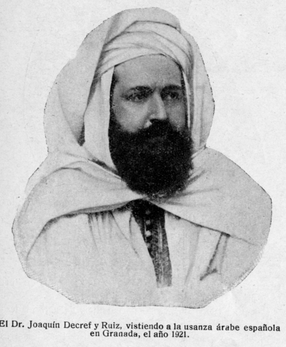 Decref y Ruíz, Joaquín (1864 – 1939). Imagen de 1921, vestido a la usanza árabe española en Granada.