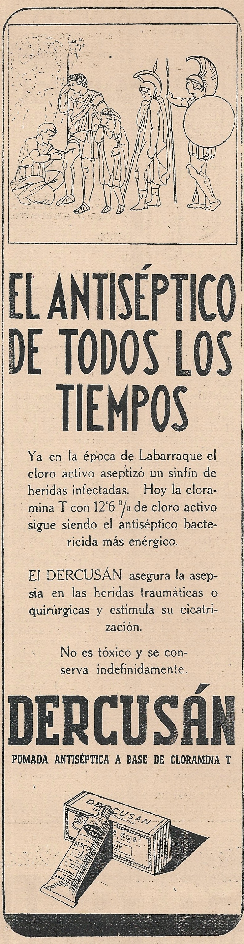 Decursán. El antiséptico de todos los tiempos. Cloramina T. Publicidad aparecida en la revista Gaceta Médica Española, año XIX, número 5. 1945.