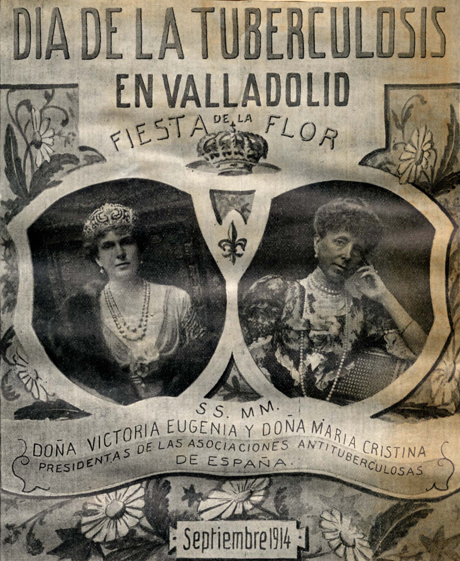 Cartel anunciador de la “Fiesta de la Flor”, celebrada en Valladolid en Septiembre de 1914 en coincidencia con el Dia de la Tuberculosis, y con el auspicio de las Asociaciones españolas anituberculosas, que contaban en su Presidencia con Sus Majestades las Reinas Victoria Eugenia y Maria Cristina.
