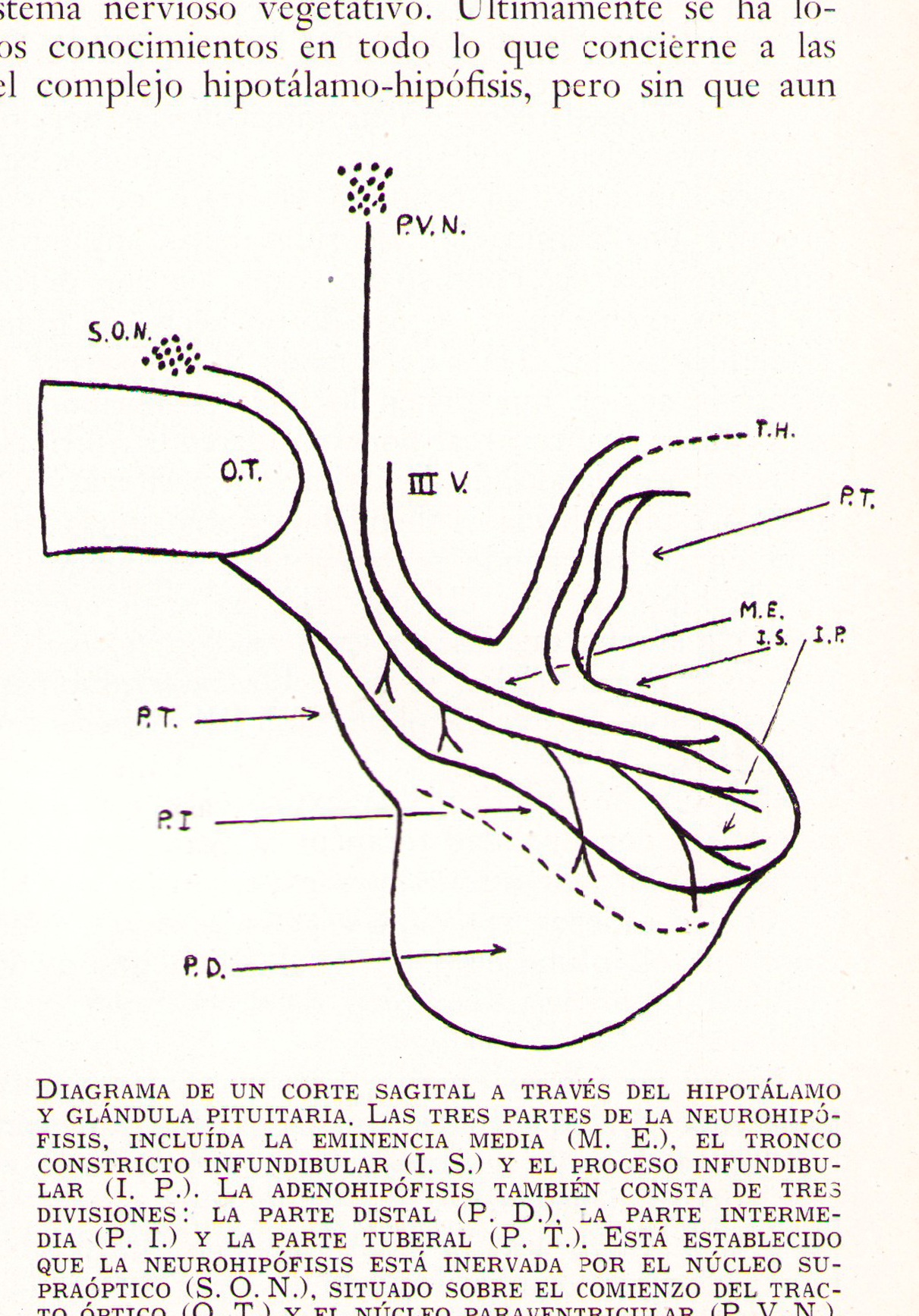 Diagrama de un corte sagital a través del hipotálamo y glándula pituitaria, las tres partes de la neurohipófisis, incluída la eminencia media, el tronco constricto infundibular y el proceso infundibular. La adenohipófisis también consta de tres divisiones: la parte distal (P. D.), la parte intermedia (P. I.) y la parte tuberal (P. T.). Está establecido que la neurohipófisis está inervada por el núcleo supraóptico (S. O. N.), situado sobre el comienzo del tracto óptico (O, T.) y el núcleo paraventricular (P. V. N.). El cual está en íntima relación con el tercer ventrículo (III v.). Otras fibras, constituyendo el tracto tuberohipofisario (T. H.), corren también hacia la hipófisis, pero su origen es desconocido. (según harris.)