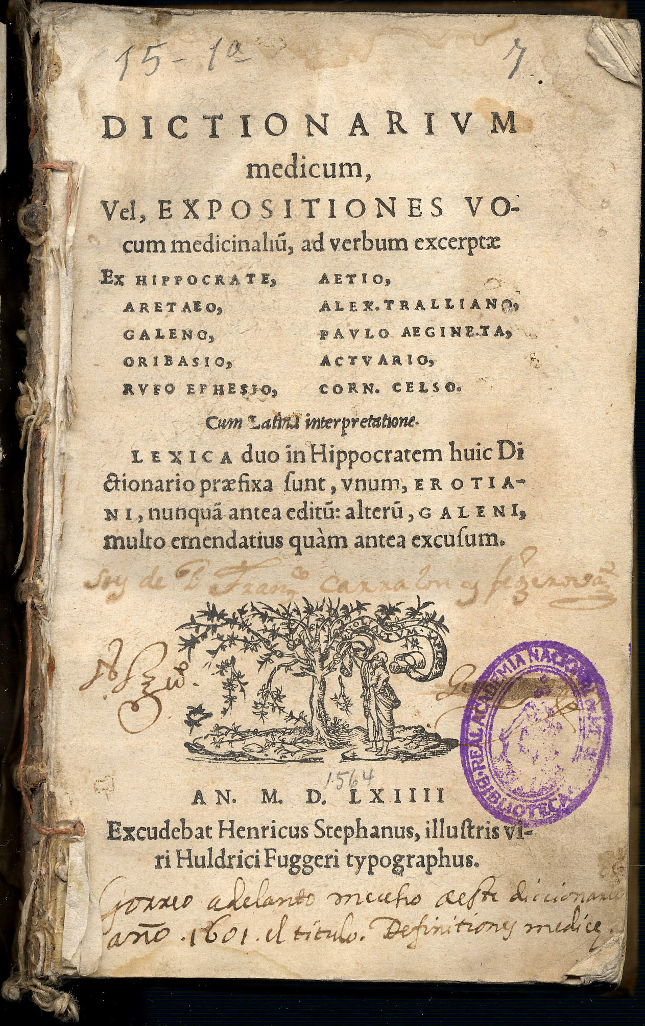 DICTIONARIUM medicum… – [S. l.] : Excudebat Henricus Stephanus, 1564. – 608, [27] p. ; 8º [16 cm.]. – Perg.