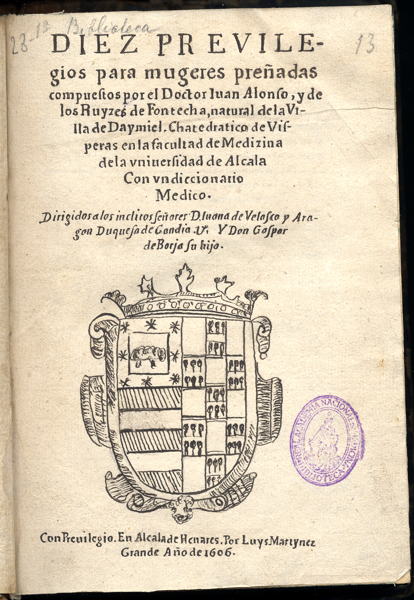 ALONSO Y DE LOS RUYCES DE FONTECHA, Juan. – Diez previlegios para mugeres preñadas… – Alcalá de Henares: por Luys Martínez Grande, 1606. – [10], 230, 158 h.; 4º