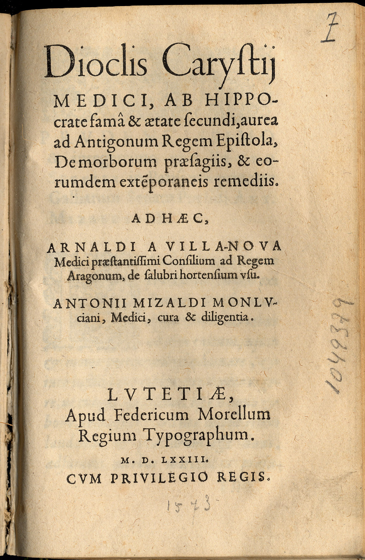 MIZAULD, Antoine (1510-1578). – Dioclis Caryisti medici, ab Hippocrate fama & aetate secundi, aurea ad Antigonum regem epistola De morborum praesagiis, & eorundem extemporaneis remediis, ad haec ; Arnaldi Villa-Nova… de salubri hortensium usu. – Lutetiae : Apud Federicum Morellum, 1573. – [4], 27 h. ; 8º [17 cm.]. – Perg.