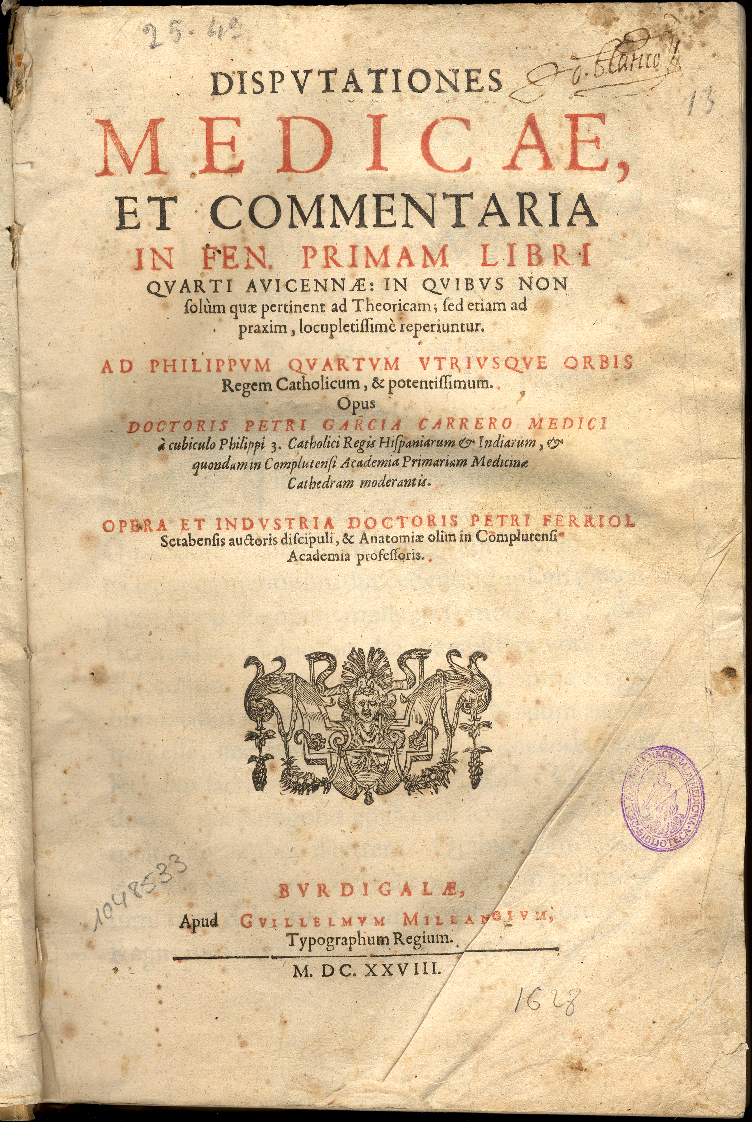 GARCÍA CARRERO, Pedro. – Dispvtationes medicae… – Bvrdigale : apud Gvillelmvm Millangivm, 1628. – [6], 1122, [12] p.; Fol.