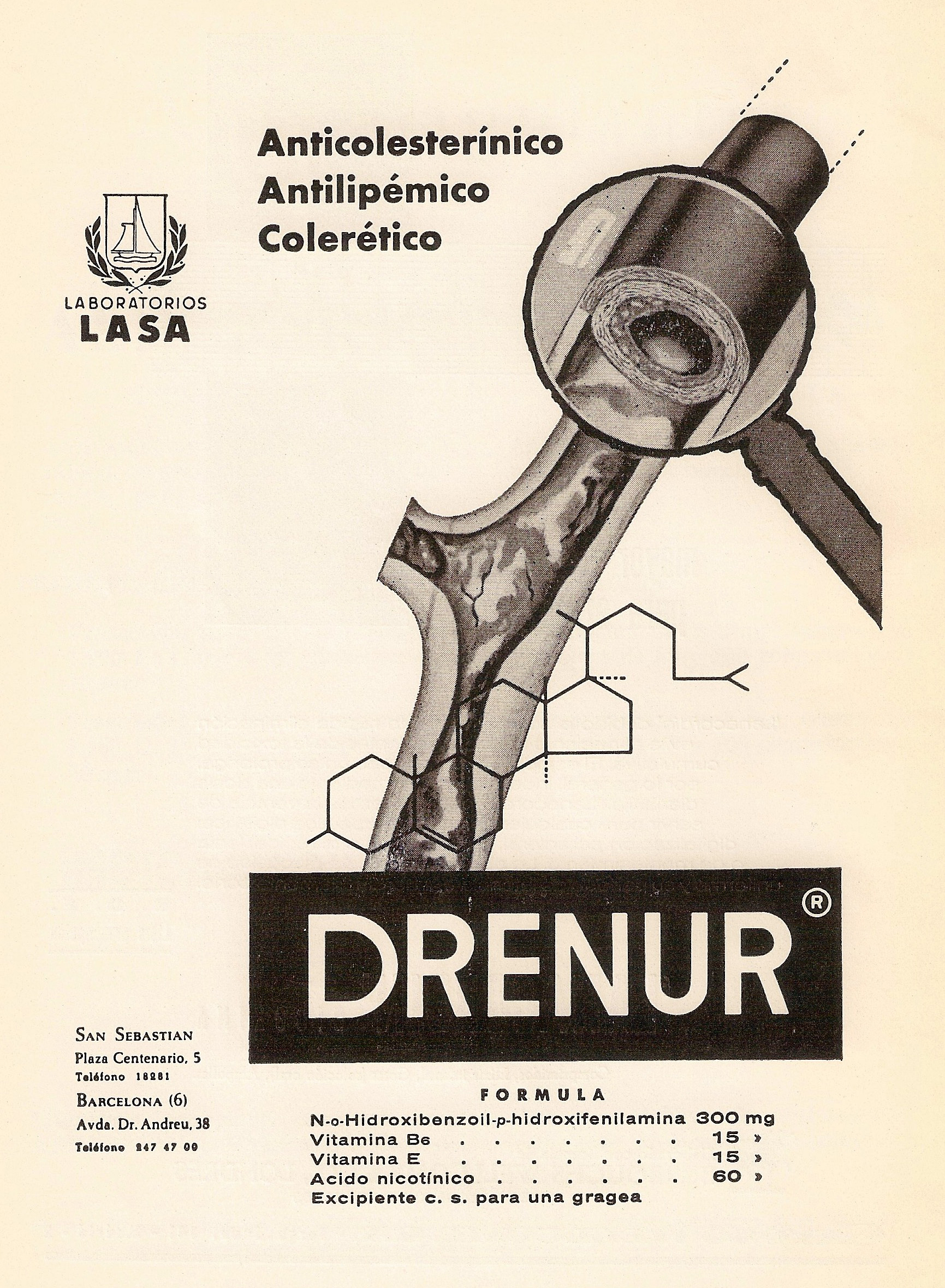 Drenur. Anticolesterínico, antilipémico, colérico. Laboratorios Lasa. Revista Española de Cardiología, 1966