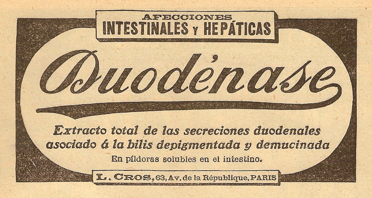 Duodenase. Afecciones intestinales y hepáticas. Publicidad frecuente en revistas. 1918.