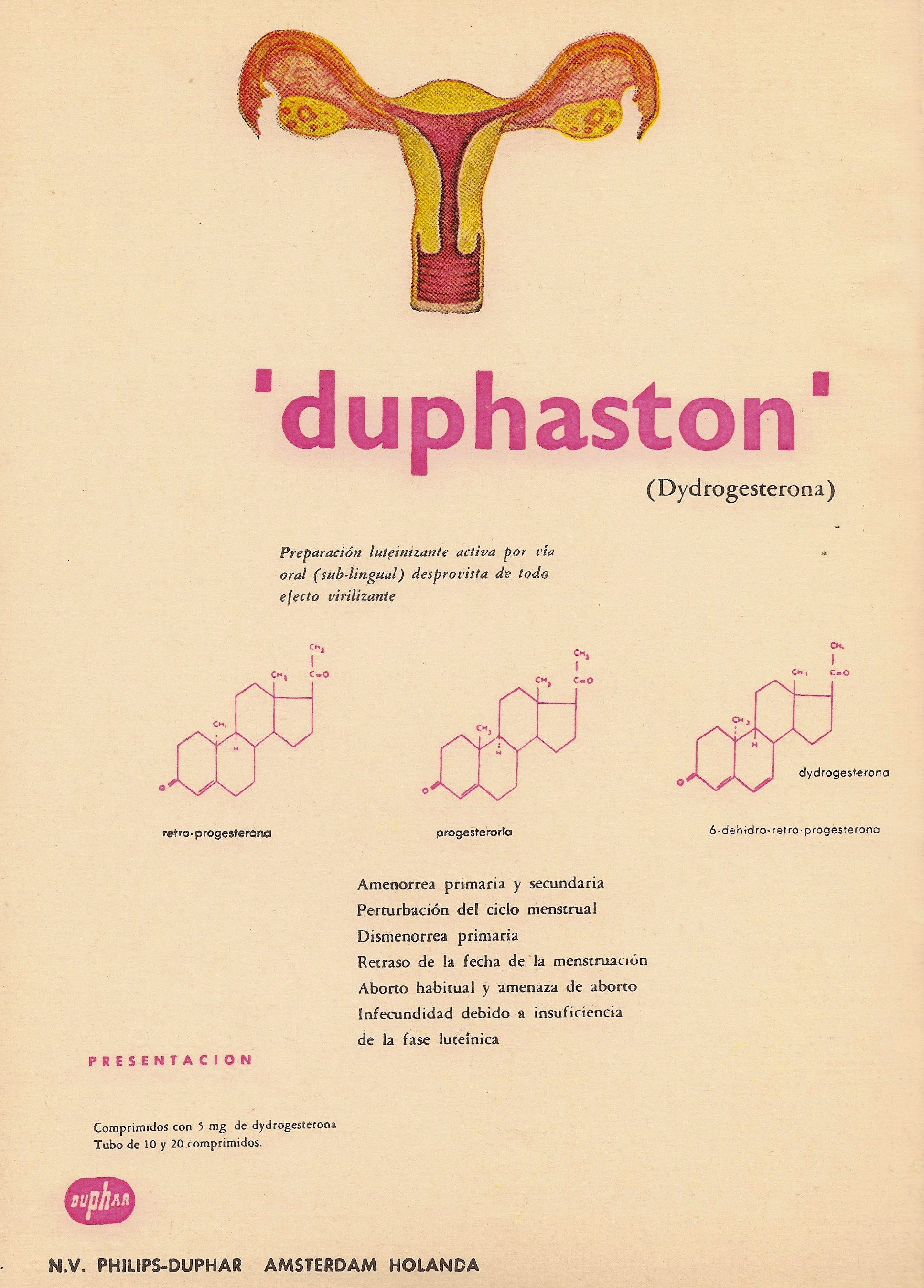 Duphaston. Dydrogesterona. Amenorrea primaria y secundaria. Dismenorrea. Philips-Duphar, Amsterdam, Holanda. Archivos de la Facultad de Medicina de Madrid, 1962.