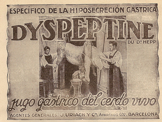 Dyspeptine. Jugo gastrico de cerdo vivo. Epecífico de la hiposecreción gástrica. Uriach y Cª. Barcelona. La Medicina Íbera, 11 de abril de 1931.