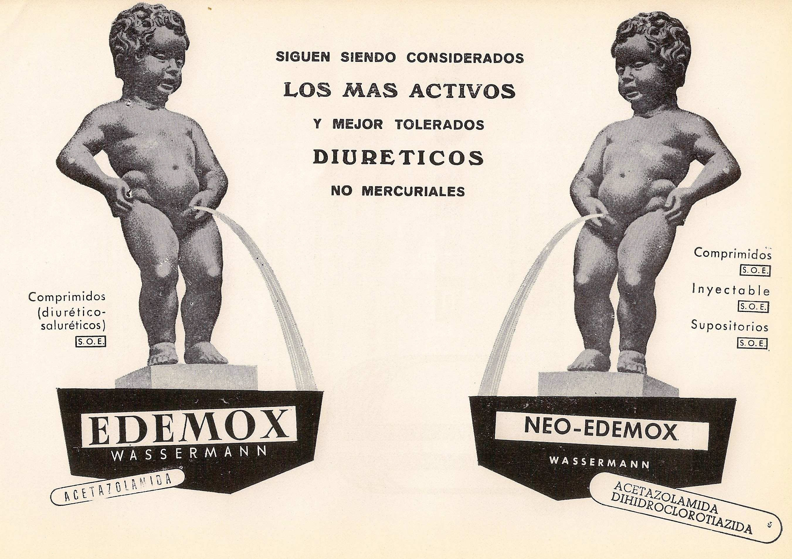 Edemox. Neoedemox. Acetazolamina con y sin dehidroclorotiazida. Los más actvos y mejor tolerados diuréticos no mercuriales. Wassermann. Revista Española de Cardiología. 1966.