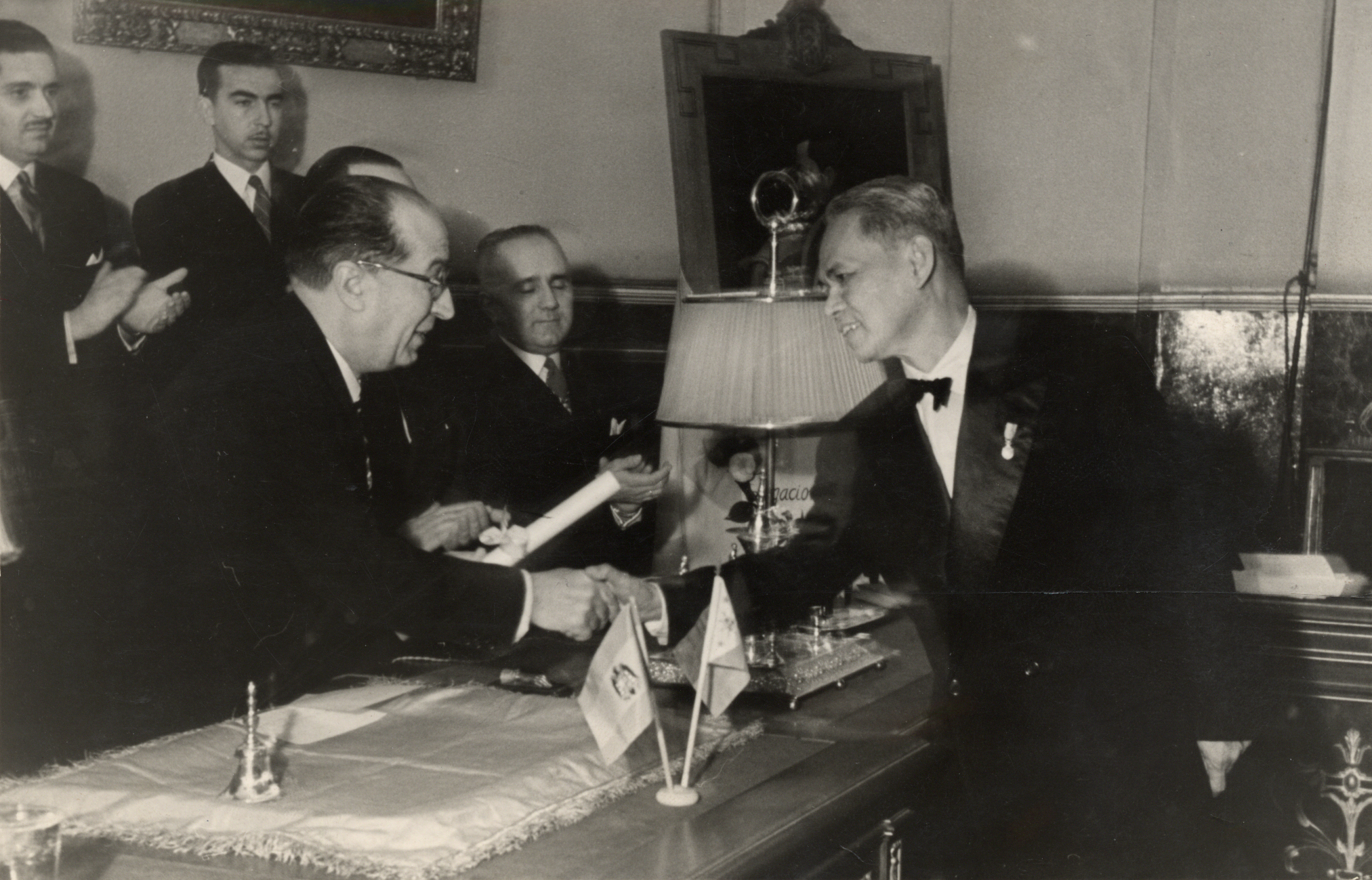 El Vicepresidente de la Real Academia Nacional de Medicina, Prof. Carro, acompañado del Ministro de Filipinas, Sr. Nieto, y del Secretario Perpetuo de la Corporación académica, Prof. Matilla, entregando al Prof. José Bantug, de Filipinas, el título de Académico Correspondiente Extranjero en el acto celebrado el 3 de Febrero de 1949. Al fondo, el cuadro donado a la Academia por Filipinas en el que aparece el Dr. José P. Rizal, médico, farmacólogo, intelectual y héroe nacional de Filipinas.