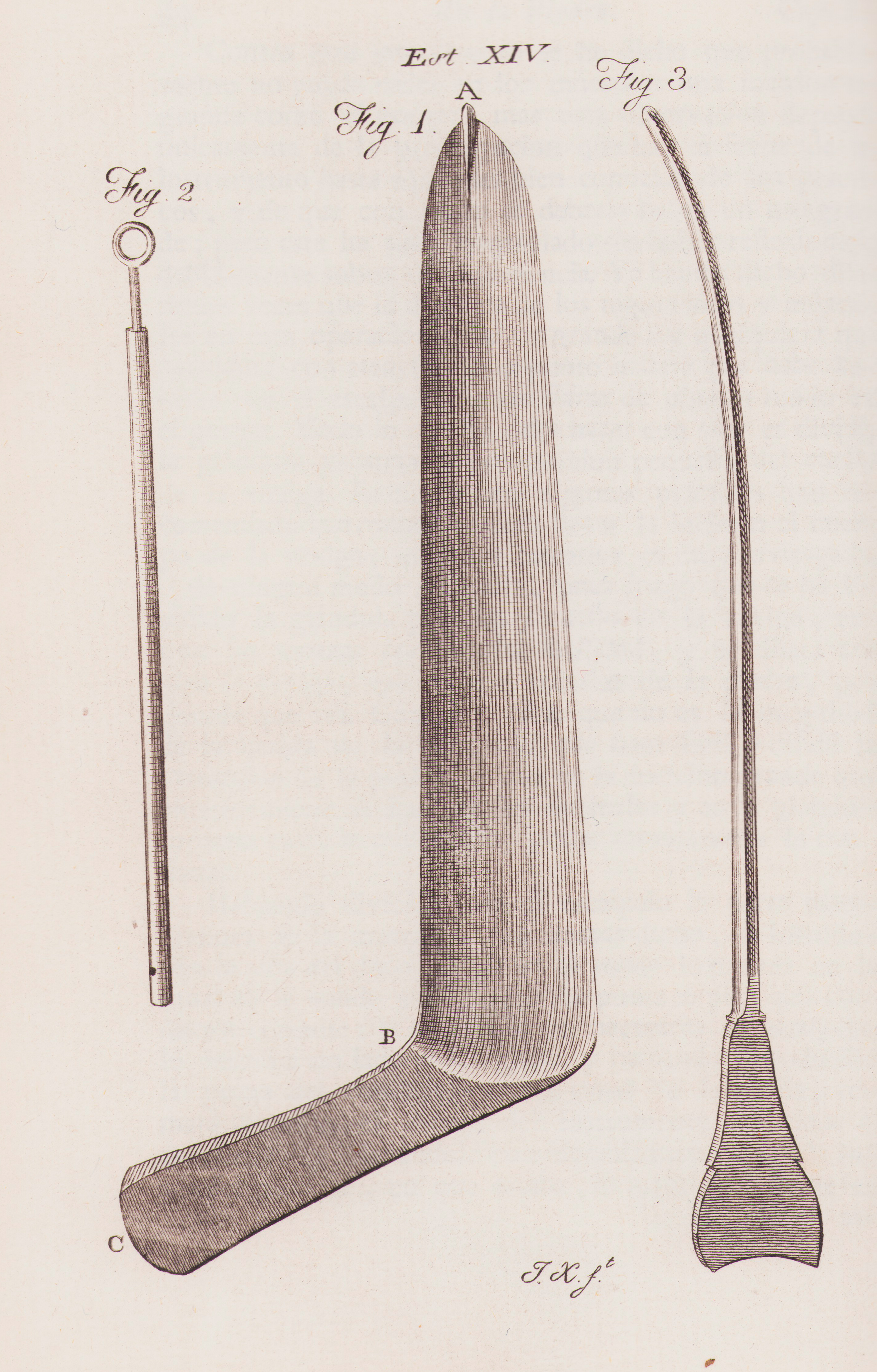 Lámina 14: Figura 1: El gorget cortante de Hawkins, cuyo corte es mas ancho que lo acostumbrado y así divide mas la glándula próstata. Figura 2:Cateter para mujeres, es recto para introducirlo con más facilidad.La figura 3 representa una más curva en esta forma.