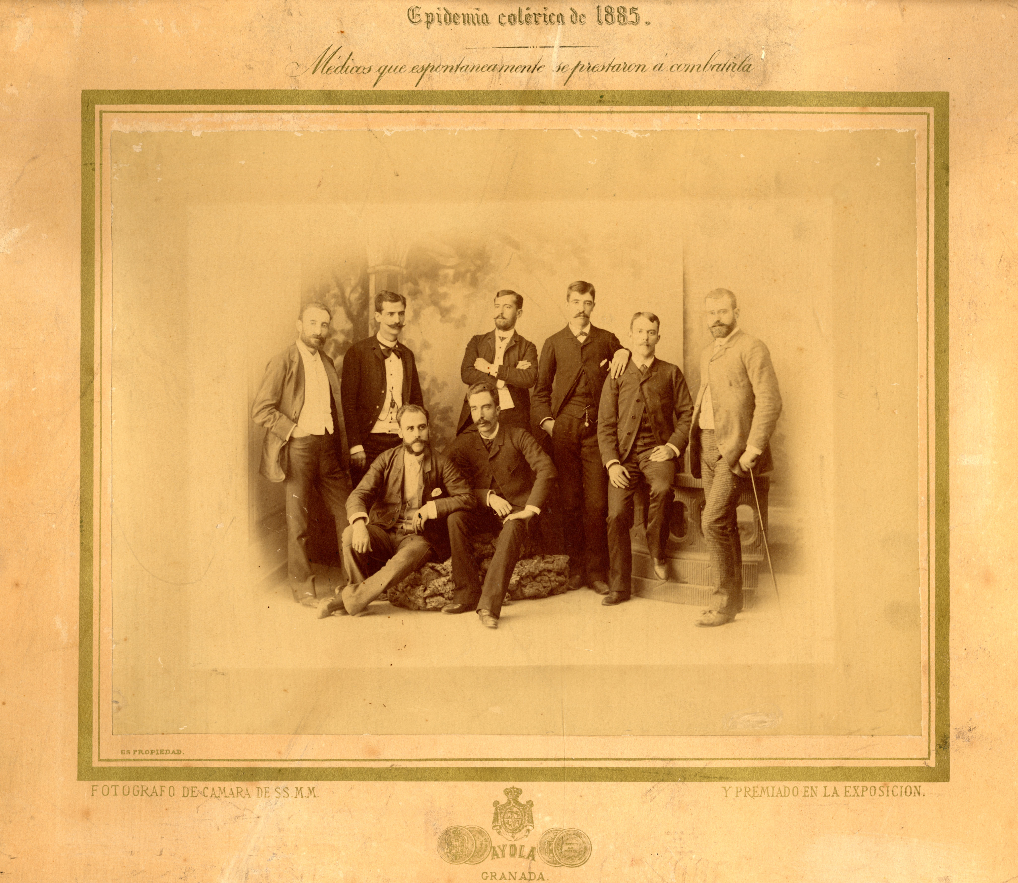 Grupo de médicos que, pese al riesgo de contagio, se ofrecieron espontaneamente a combatir la epidémia de cólera de los años 1884-1885 en España. En el reverso aparecen las firmas de Martínez Saldise, Sanz Maron, J. A. Jiménez y Mariano de la Puente. Fotógrafía de José García Ayola, fotógrafo de Cámara del Rey Alfonso XII, que se conserva en la Real Academia Nacional de Medicina.