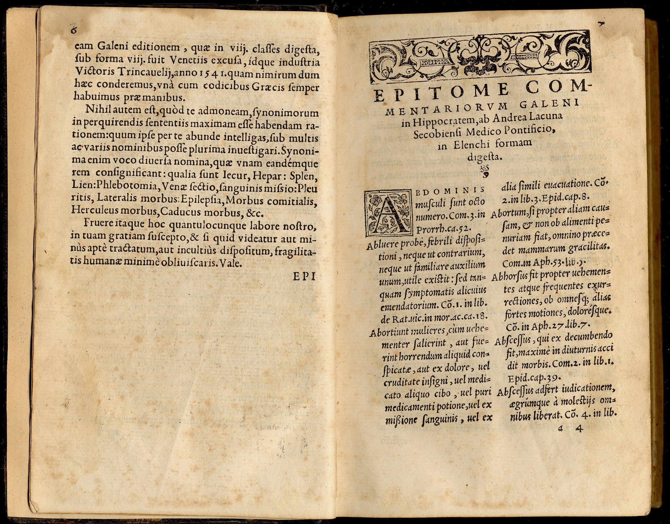 LAGUNA, Andrés (m. 1560). — Epitome omnium rerum sententiarum, quae annotatu dignae in commentariis Galeni in Hippocratem… – Lugduni : Apud Guliel Rouillium, 1554. — 477 p. ; 8º (17 cm). – Piel