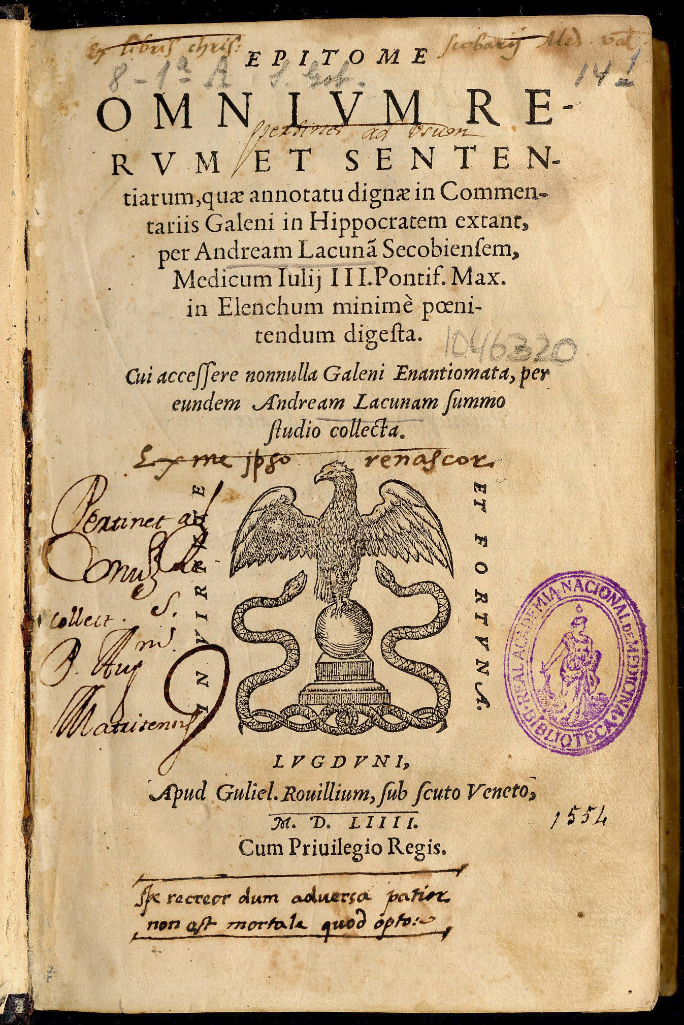 LAGUNA, Andrés (m. 1560). — Epitome omnium rerum sententiarum, quae annotatu dignae in commentariis Galeni in Hippocratem… – Lugduni : Apud Guliel Rouillium, 1554. — 477 p. ; 8º (17 cm). – Piel