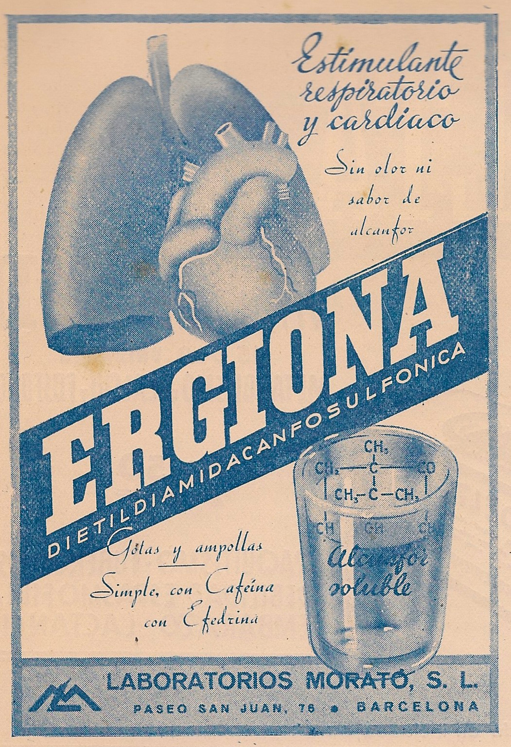 Ergiona. Dietildiamidacanfosulfonica. Gotas, ampollas. Con cafeína y efedrina. Estimulante respiratorio y cardiaco. Laboratorios Morató. SL. Barcelona. Publicidad aparecida en la revista Gaceta Médica Española. Año 18, número 1, 1944.