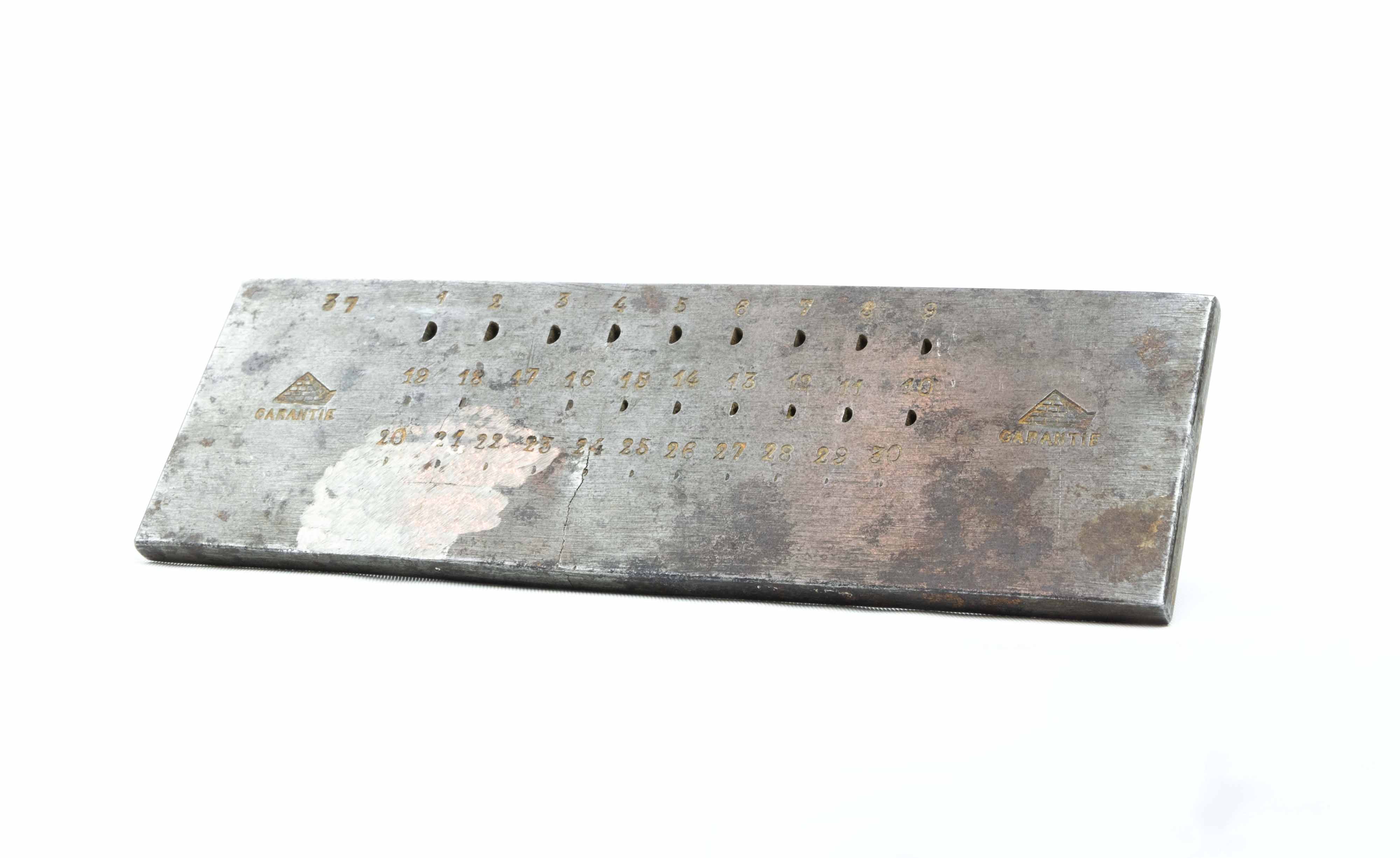 Escala de hierro con nueve agujeros semicirculares, dentro de los cuales están los números del 1 al 9. En los extremos, el logotipo de la marca “Garantie” y una pirámide.