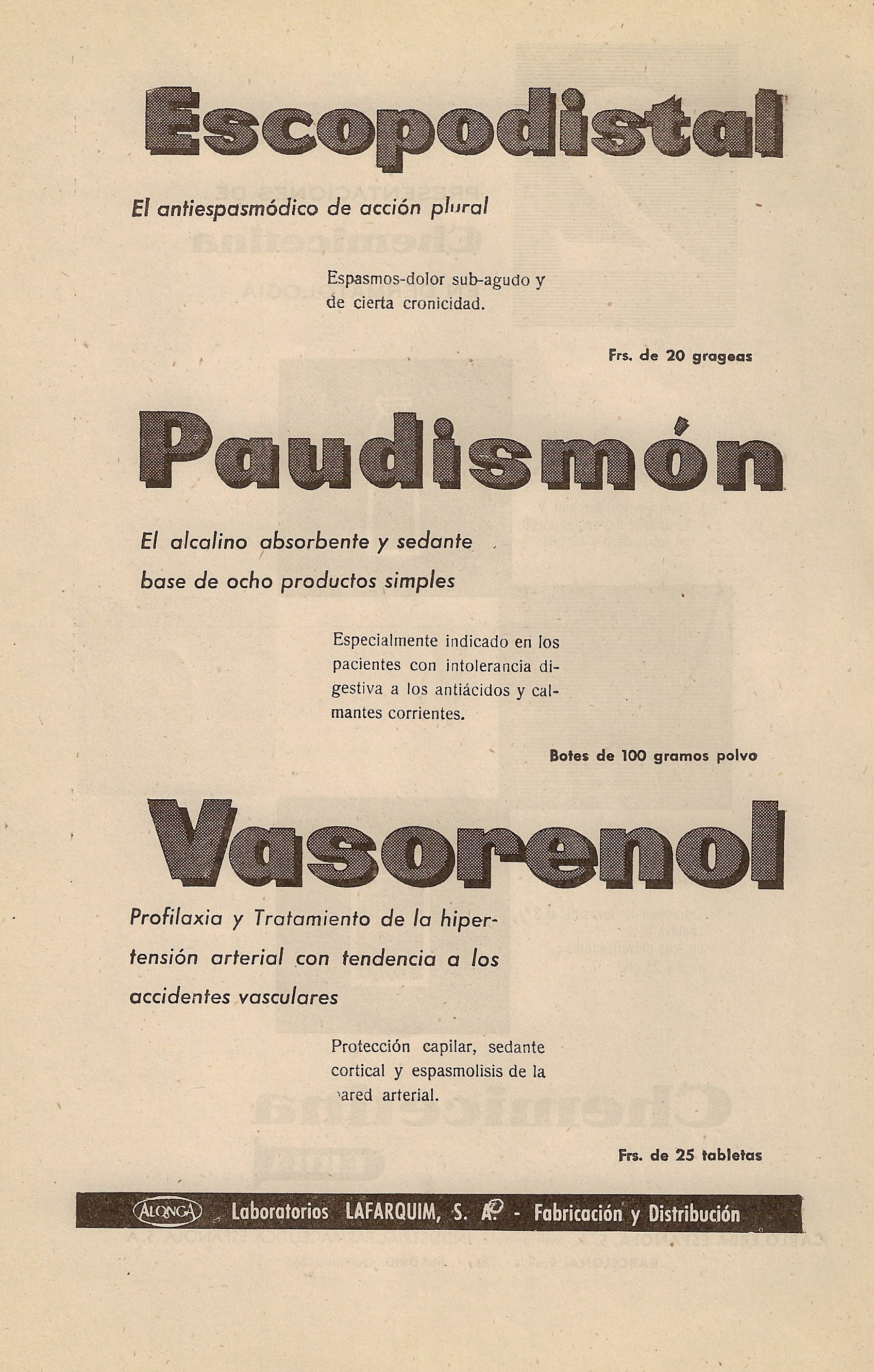 Escopodistal. Paudismon, Vasorenol. Laboratorios LAFARQUIN, S.A.. ALONGA. Hispalis Médica, 1958.