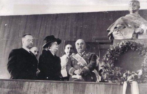 Escuela de Estomatología. Inauguración. 1945. Viuda de Aguilar, Enríquez de Salamanca, García Gras, Fracnisco Franco. Ante el busto de Florestán Aguilar esculpido por Benlliure