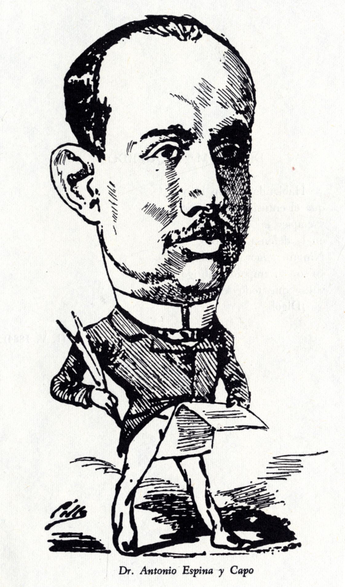 Caricatura del Dr. D. Antonio Espina y Capo (1850 – 1930), por Cilla, sacada del libro del Prof. D. Luís Sánchez Granjel, ‘Biografía de “El Dr. Sangredo” (1883-1884)’, que fue una revista médica del siglo XIX que se subtitulaba “Revista satírica quincenal. Dedicada a los hijos de Esculapio”. Pag. 77.