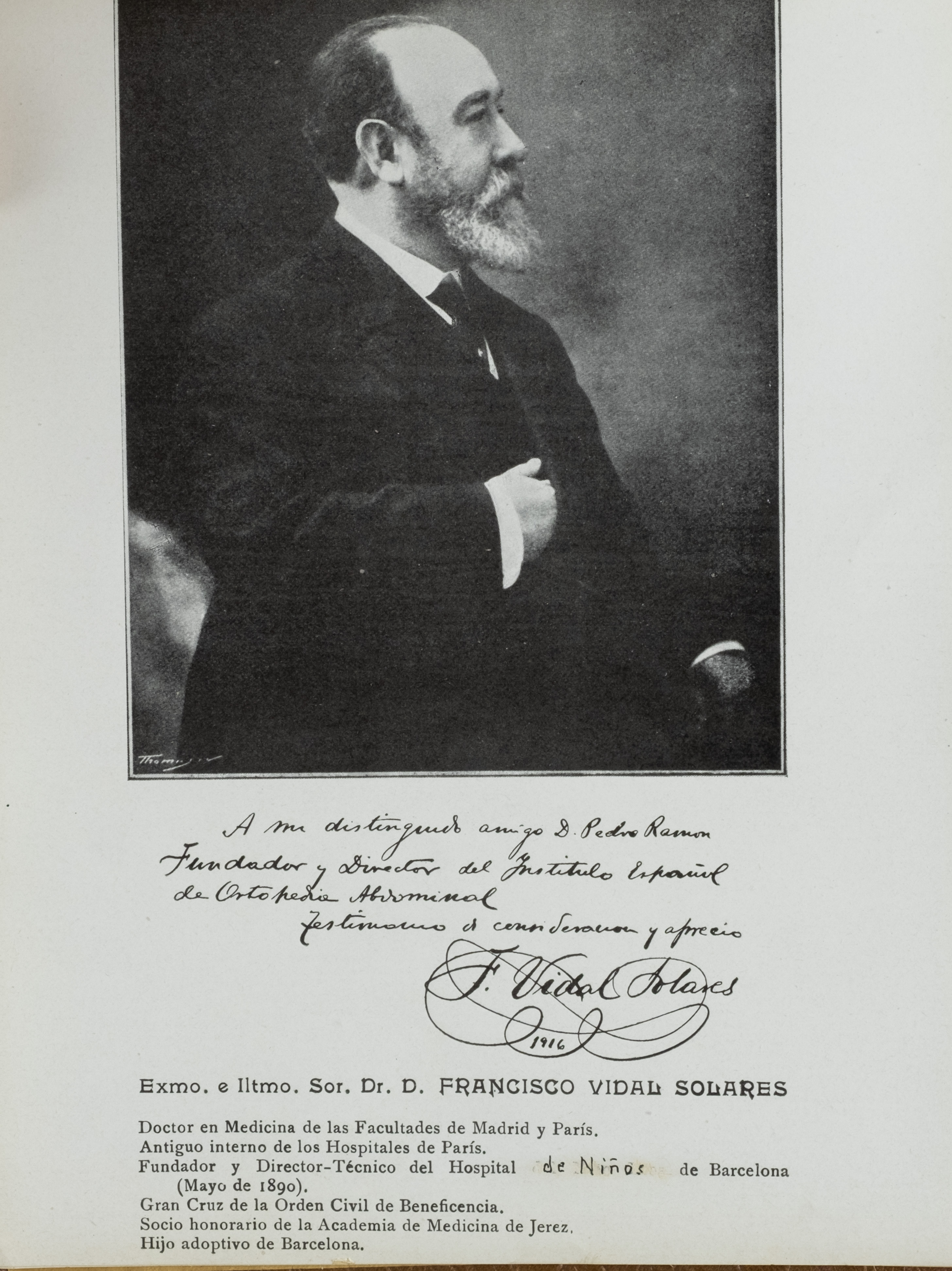 Doctor en Medicina de las Facultades de Madrid y Paris. Antiguo interno de los Hospitales de París. Fundador y Director-Técnico del Hospital de Ninos de Barcelona(Mayo de 1890). Gran Cruz de la Orden Civil de Beneficencia. Socio honorario de la Academia de Medicina de Jerez, Hijo adoptivo de Barcelona.