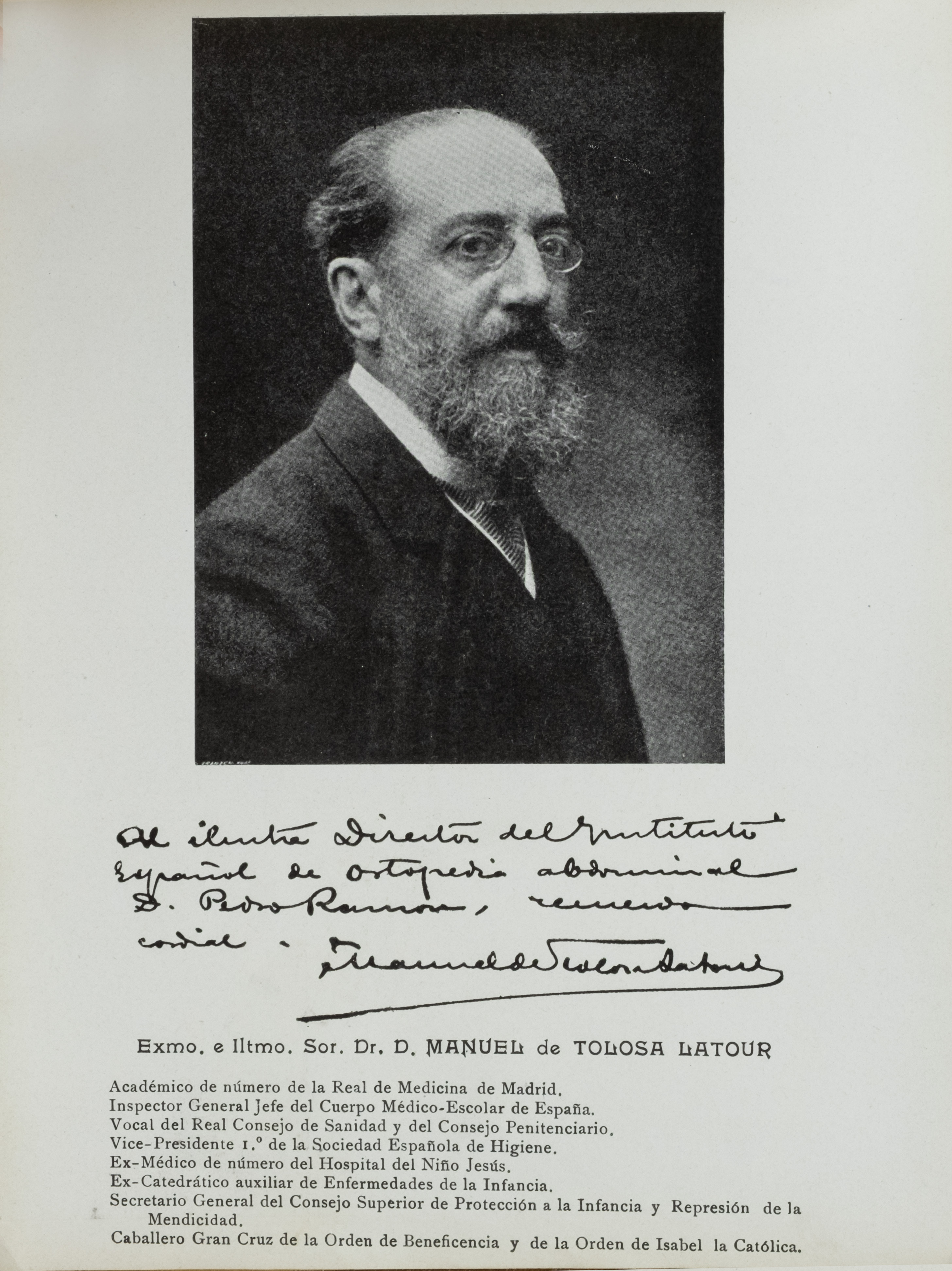 Académico de número de la Real de Medicina de Madrid, Inspector General Jefe del Cuerpo Médico-Escolar de España. Vocal del Real Consejo de Sanidad y del Consejo Penitenciario, Vice-Presidente I, de la Sociedad Española de Higiene. Ex-Médico de número del Hospital del Nino Jesus, Ex-Catedrático auxiliar de Enfermedades de la Infancia. Secretario General del Consejo Superior de Protección a la Infancia y Represión de la Mendicidad Caballero Gran Cruz de la Orden de Beneficencia y de la Orden de Isabel la Católica.