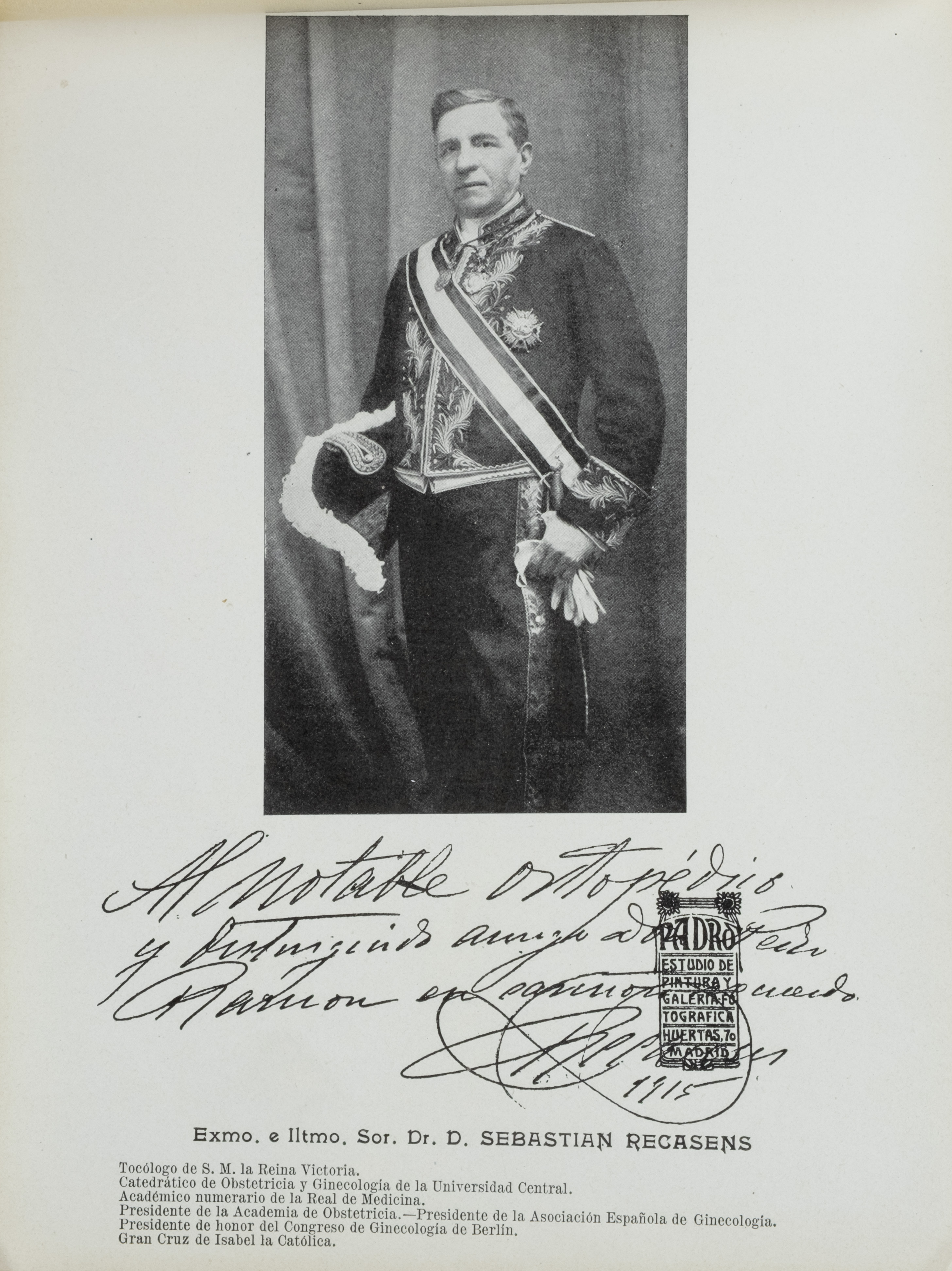Tocólogo de S. M. la Reina Victoria. Catedrático de Obstetricia y Ginecologia de la Universidad Central. Académico numerario de la Real de Medicina. Presidente de la Academia de Obstetricia-Presidente de la Asociación Española de Ginecologia. Presidente de honor del Congreso de Ginecologia de Berlin. Gran Cruz de Isabel la Católica.