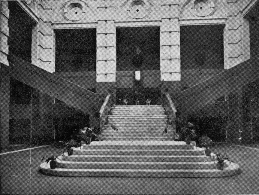 Gran vestíbulo de la nueva Facultad de Medicina de Valencia, inaugurada en 1943 con el I Congreso Departamental de Medicina Práctica. Gaceta Médica Española, 199, abr. 1943, 115-P
