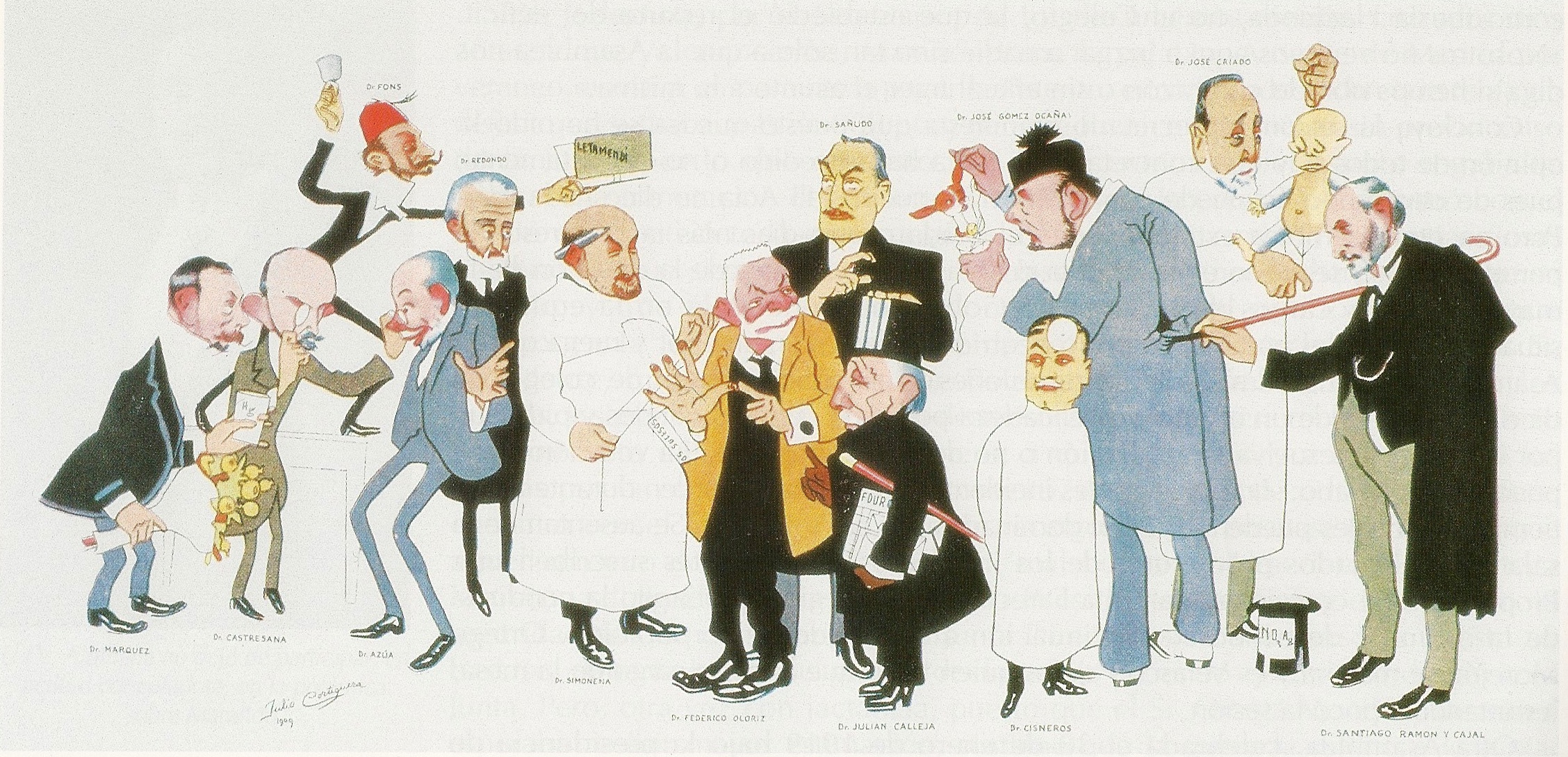 Claustro de Profesores de la Facultad de Medicina. San Carlos. Madrid. Caricatura de Julio Cortiguera, 1909