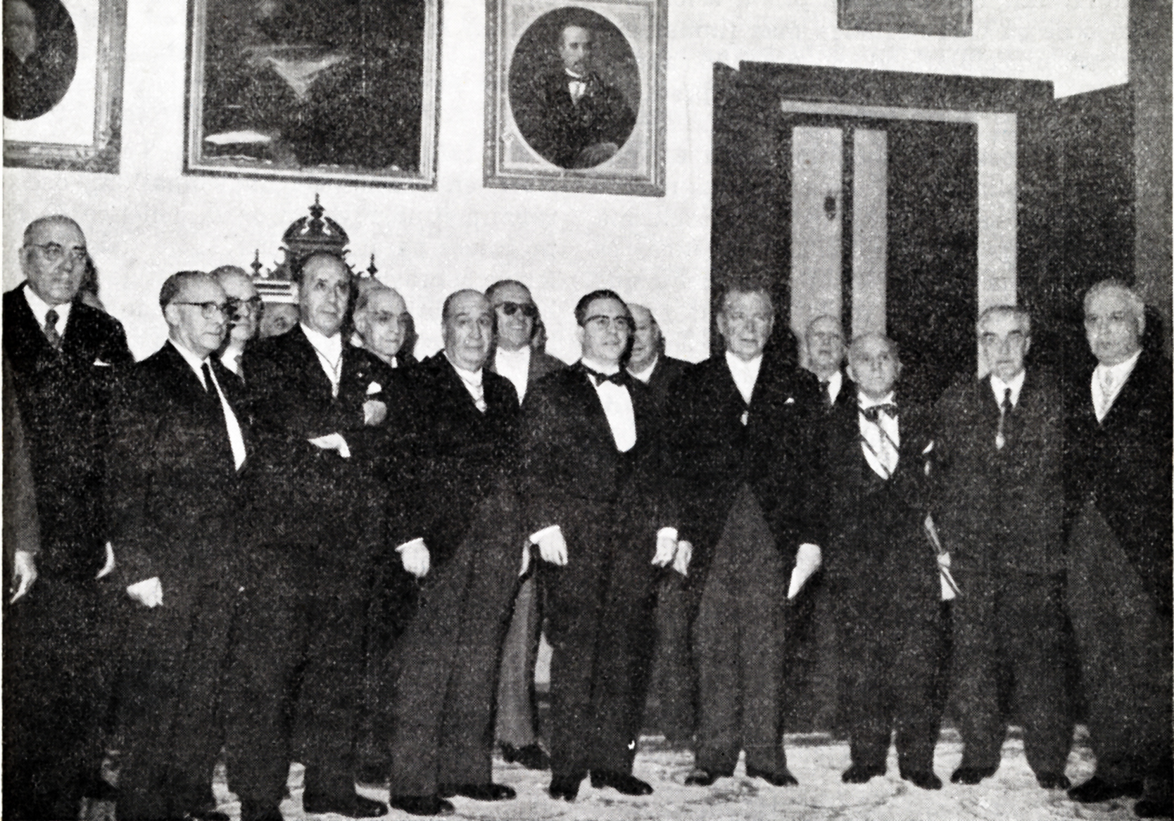El Dr. Dimas Fernández-Galiano y Fernández (en el centro, con pajarita y gafas), acompañados por varios Sres. Académicos el día de su recepción como Académico Numerario de la Real Academia Nacional de Medicina.