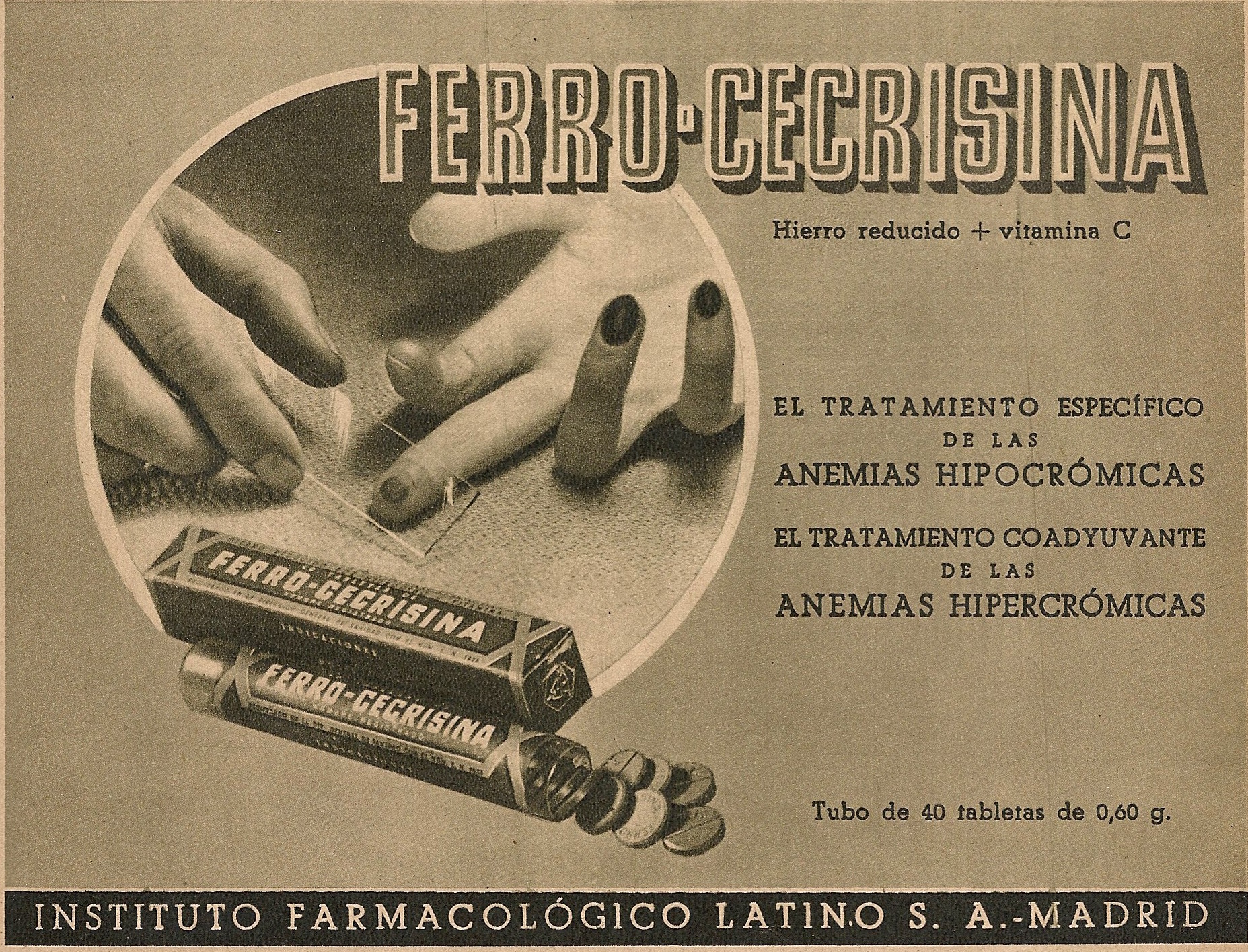 Ferro-Cecresina. Anemias. Instituto Farmacológico Latino Madrid. Publicidad de los años 40 (siglo XX)