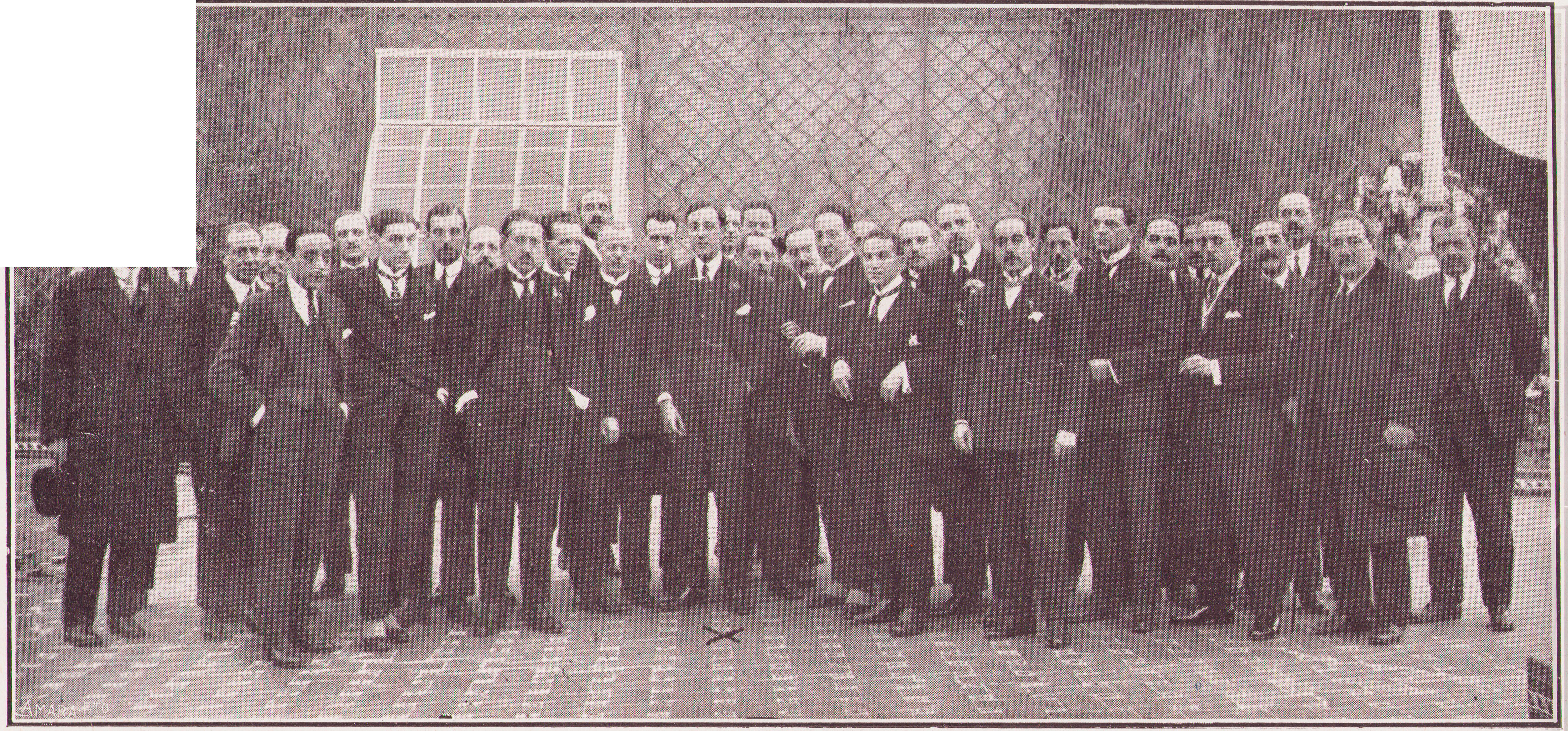 D. Manuel Garcia Miranda, rodeado de los amigos y compañeros que le obsequiaron con un banquete en el Casino de Madrid el dia 24 del actual, para festejar su nombramiento de profesor de la Escuela de Estudios Superiores del Magisterio.