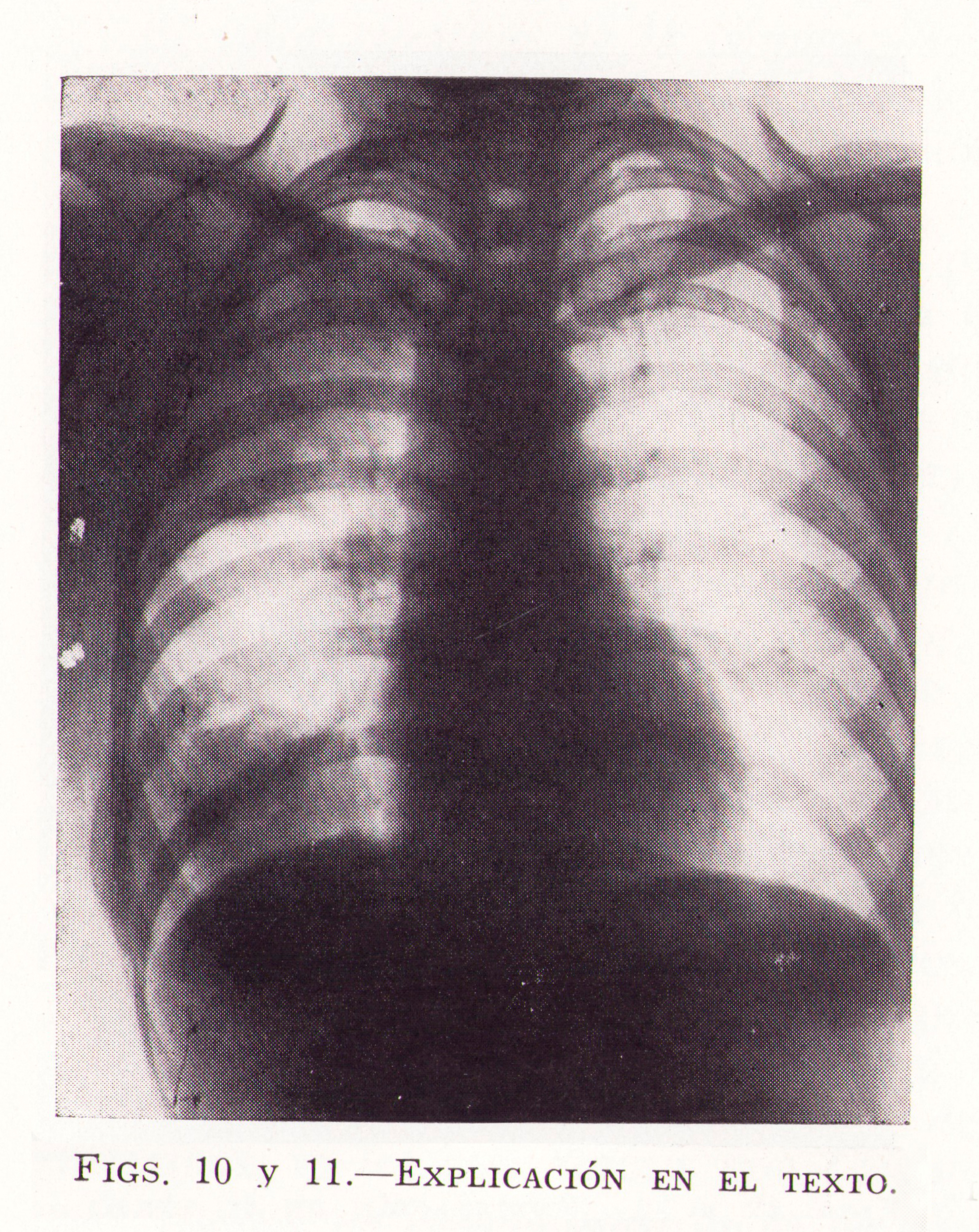 Fig.10. CASO N. 4. Natural de Alconaba (Soria), de 19 años de edad. Tuvo hace dieciocho meses una pulmonía (?): fiebre, tos, dolor de costado y expectoración sanguinolenta. Ingresó en el Hospital el 8-5-1933. Se puso bien, y hace tres meses otra vez los mismos sintomas, durando unos quince días: hace treinta días, sólo expectoración con sangre, que ha seguido hasta la fecha; disnea de esfuerzo, cansancio muscular: ha perdido de peso. Submatidez en base derecha, disminución de murmullos en la misma región. Velocidad de sedimentación, 42 a la hora: 11.600 leucocitos en la fórmula leucocitaria; 2’5 por ciento de eosinófilos, Reacción de Casoni, fuertemente positiva, la precoz y la tardía,